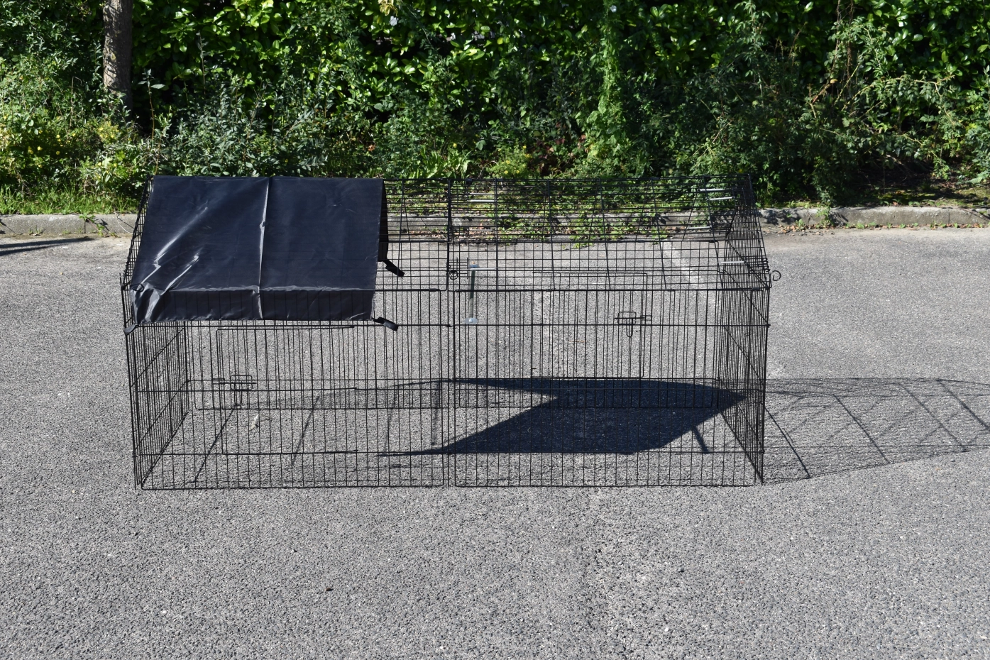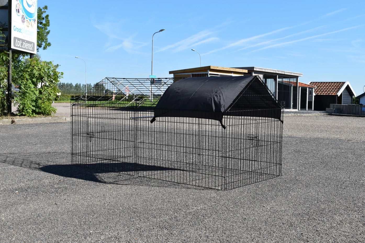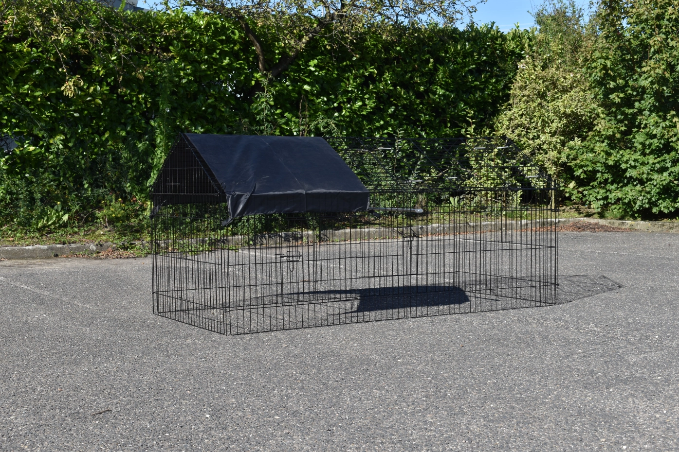 zwarte draadkooi, met zonnescherm