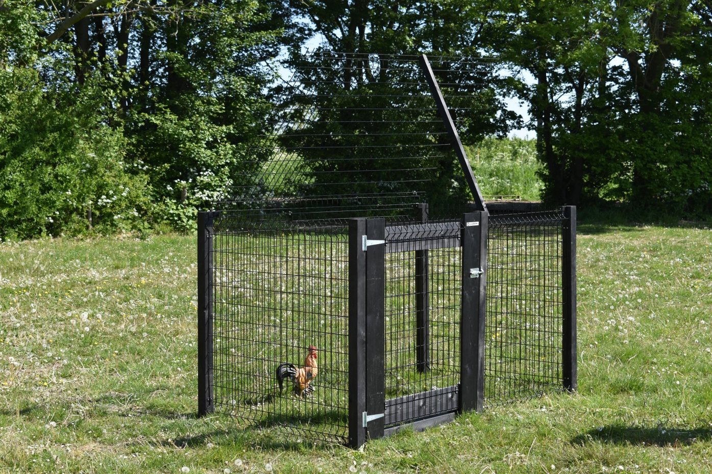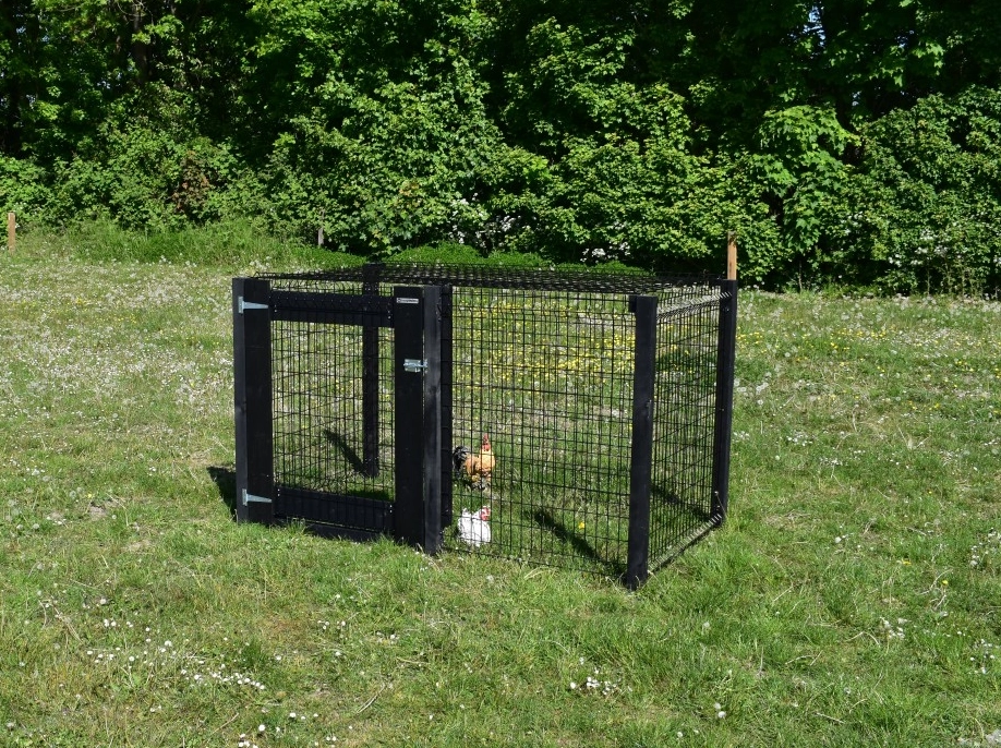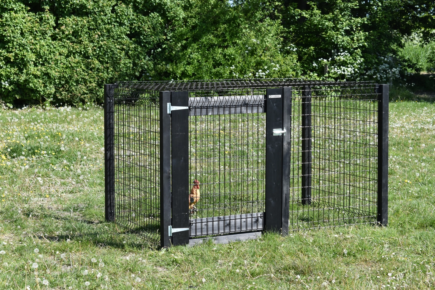 Dierenren Rectangle 2x1,3m met dak zwart/zwart is een prachtige uitloopren voor uw kippen, konijnen of puppies. Omdat er een gaasdak op zit kunnen roofvogels er niet in komen en kunnen kippen niet over de rand vliegen. Door het zwarte gaas ziet u de dieren goed lopen. Om zelf makkelijk in de ren te kunnen lopen, is het gaasdak te openen. De ren is ook andersom te monteren. De houten poort is voorzien van een schuifgrendel aan de buitenkant.