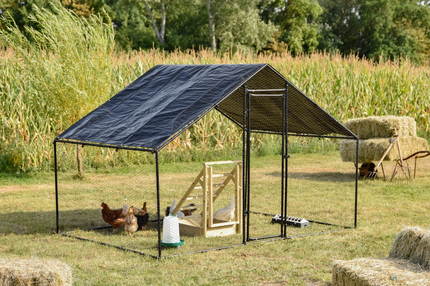 De Kippenren Grande is een ruime ren die geschikt is voor 4 tot 12 kippen. Dankzij de grote loopdeur met stevige vergrendeling loopt u eenvoudig naar binnen, terwijl de kippen veilig in de ren blijven. Het frame wordt geleverd met kippengaas dat u zelf op maat knipt en vastzet met tie-wraps. Binnen de ren is genoeg plek voor een kippenhok, een voerbak, een drinksilo of zelfs een speeltoestel voor extra beweging. Bij deze uitvoering wordt een afdekzeil meegeleverd, zodat de kippen altijd droog en beschut kunnen scharrelen, zowel bij regen als op zonnige dagen. De Kippenren Grande met afdekzeil biedt de ideale combinatie van ruimte, veiligheid en comfort.