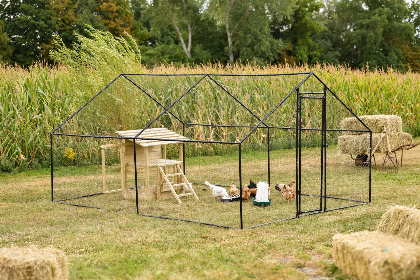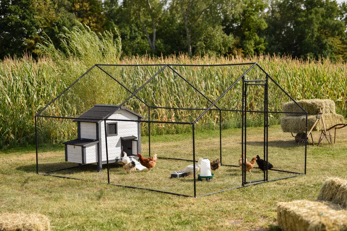 Kippenren Grande is een ruime kippenren die geschikt is voor 4 tot 12 kippen. Met de grote loopdeur en handige vergrendeling loopt u gemakkelijk naar binnen, terwijl de kippen veilig in de ren blijven. Het frame wordt geleverd met kippengaas dat u zelf op maat knipt en aan het frame bevestigt met tie-wraps. In de ren is voldoende plaats voor een kippenhok, een voerbak en een drinksilo, of zelfs een leuk speeltoestel voor extra beweging. Daarnaast kunt u eenvoudig een passend afdekzeil mee bestellen, zodat de kippen ook bij regen en zon droog en beschut kunnen zitten. Deze grote kippenren combineert veiligheid en comfort, zodat uw kippen volop de ruimte hebben.