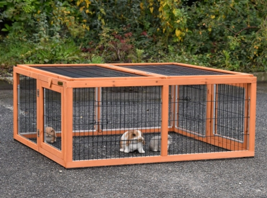 Konijnenren Multirun is voorzien van aluminium strips op de meeste randjes in de ren, om het knagen tegen te gaan. Konijnenren is volledig inklapbaar, en ook makkelijk koppelbaar aan allerlei konijnenhokken. Ook kan Konijnenren Multirun los van uw konijnenhok neergezet worden. Deze handige ren heeft in 3 zijkanten een deur in het traliewerk, en 2 zijkanten hebben een uitneembaar paneel. Hierdoor kunnen meerdere rennen gecombineerd worden. Ook de bovenkant van de konijnenren is gemakkelijk opklapbaar en eenvoudig te verwijderen. Multifunctionele ren dus !