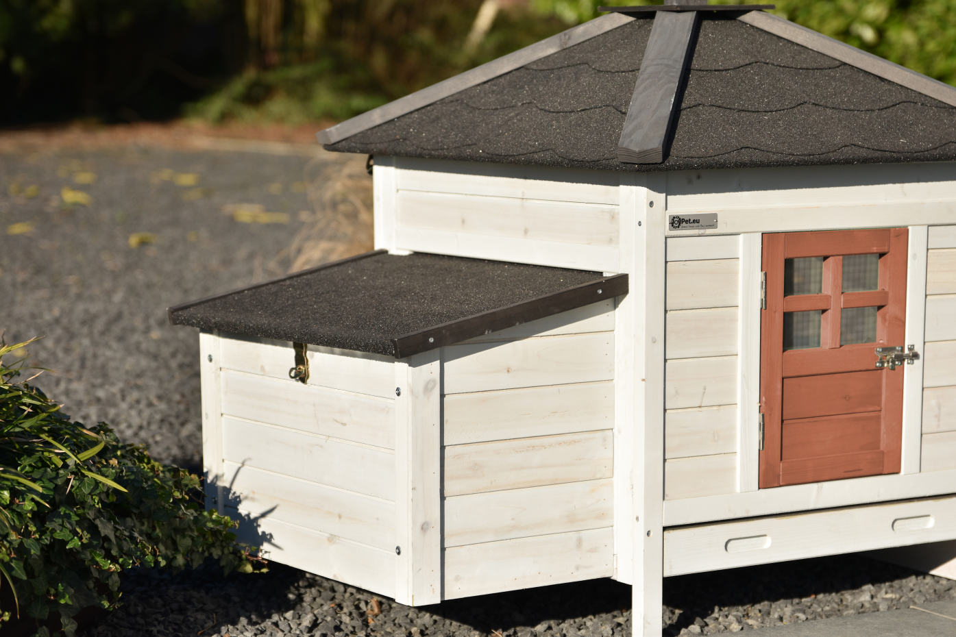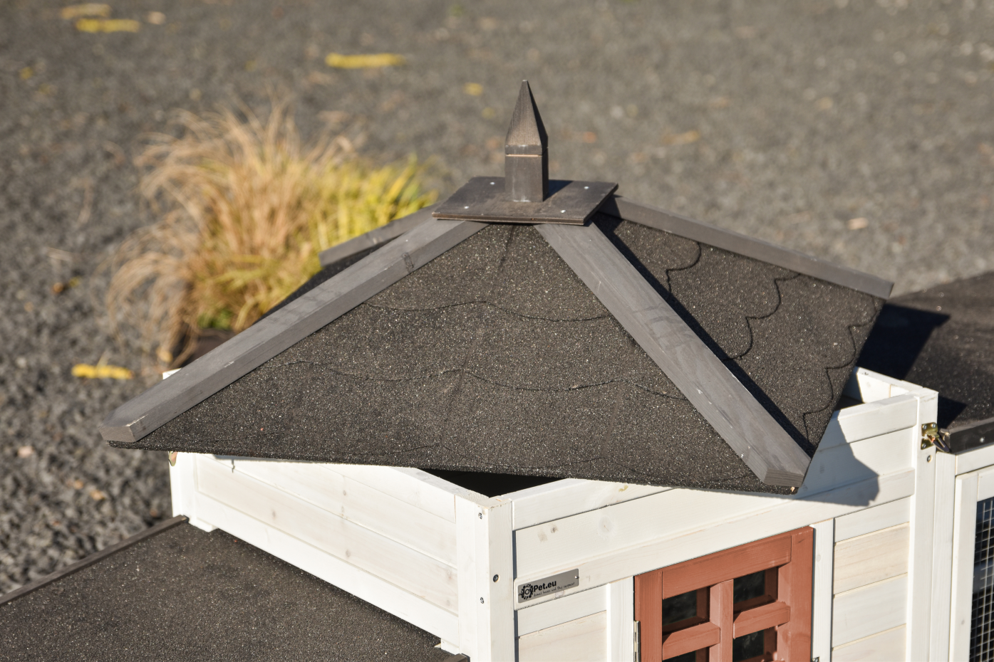 - Het hok heeft een dak met dakleer