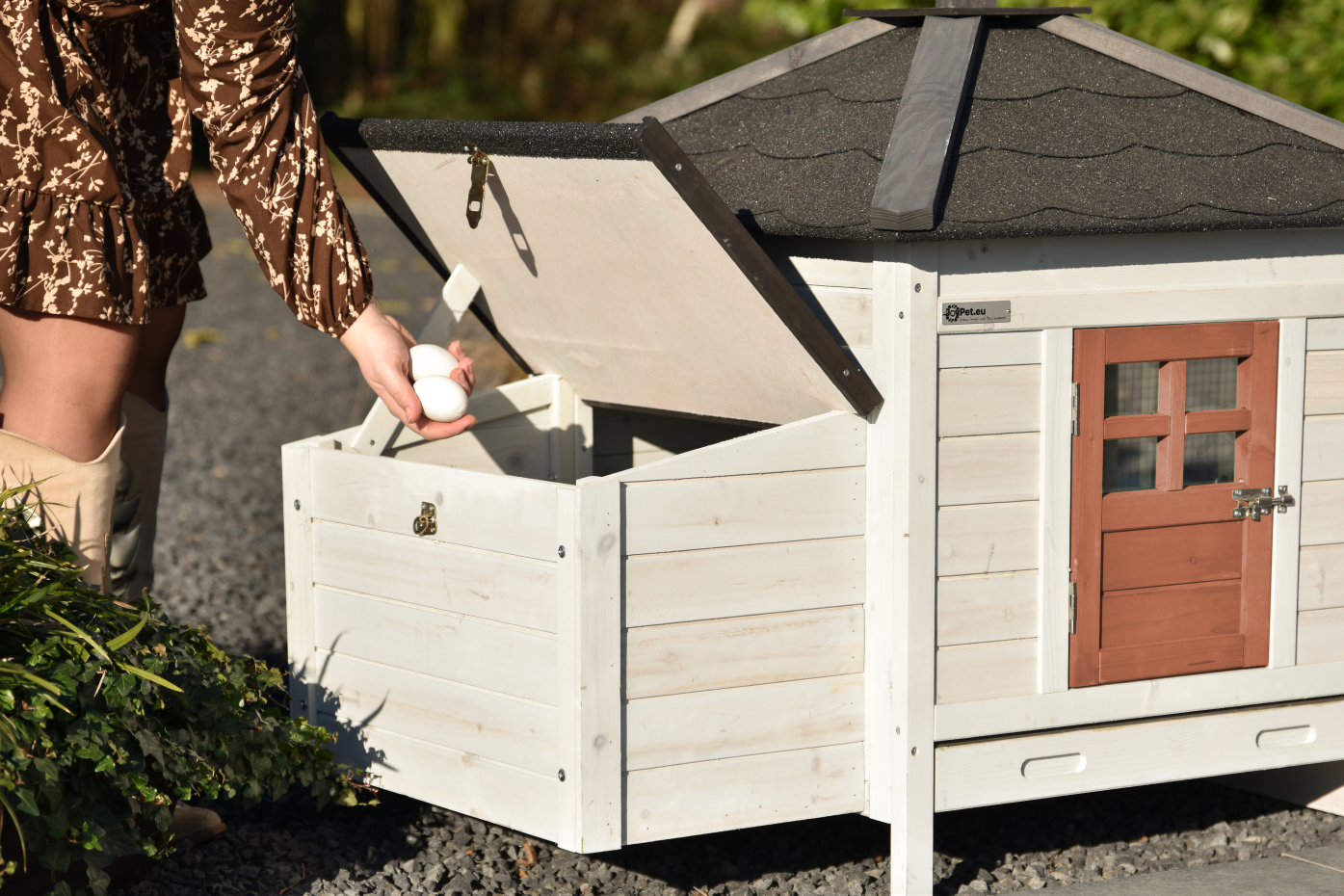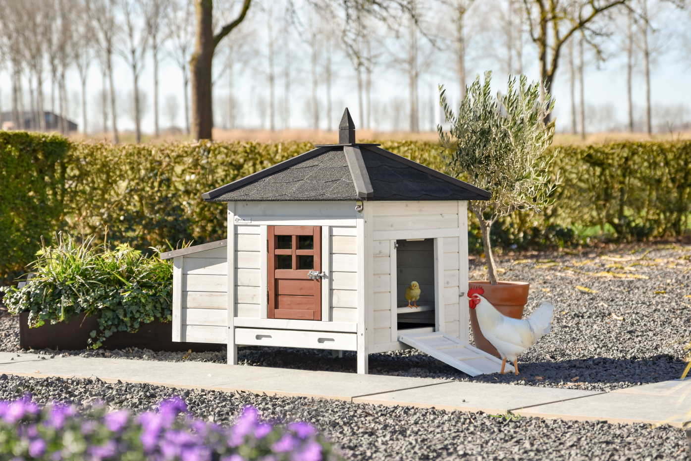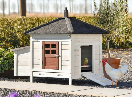 Kippenhok Ambiance Small is een echte eyecatcher in de tuin en combineert een mooie uitstraling met praktisch gebruik. Het hok is voorzien van een kunststof uitschuiflade, een volledig afneembaar dak voor eenvoudig schoonmaken en een deurtje aan de zijkant dat tegelijk als loopplank dient. Het hok staat mooi in een ruime kippenren, maar kan ook worden uitgebreid met aanbouwrennen die speciaal voor dit model zijn gemaakt. Kippenhok Ambiance Small is geschikt voor maximaal 4–8 kippen en heeft buitenwerkse afmetingen van 107x77x99 cm (bxdxh)