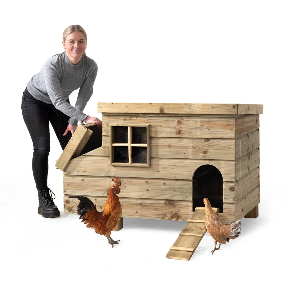Kippen nachthok Bella is een handgemaakt compact kippenhok met legnest gemaakt van onderhoudsvrije materialen. Zo is het kippenhok opgebouwd uit een geïmpregneerd houten frame en wordt deze afgewerkt met grenen rabatdelen voor een natuurlijke uitstraling. Zowel de bodem als het dak wordt verwerkt met betonplex wat voor jouw kippen extra bescherming biedt tegen optrekkend vocht en kou. Het dak zorgt tevens voor een goede afwatering doordat deze schuin loopt en is afgedicht met sterk dakleer. Het houten kippennachthok heeft een buitenafmeting van 122 x 79 x 83 cm en beschikt over twee ruime zitstokken waardoor er voldoende ruimte is voor het houden van meerdere kippen. Het legnest aan de linkerzijde is vanaf buiten het verblijf te openen, ideaal bij het rapen van de verse kippeneitjes in de ochtend! Kippenhok Bella wordt geleverd als prefab bouwpakket waardoor hij eenvoudig te monteren is met de bijgeleverde montagehandleiding.