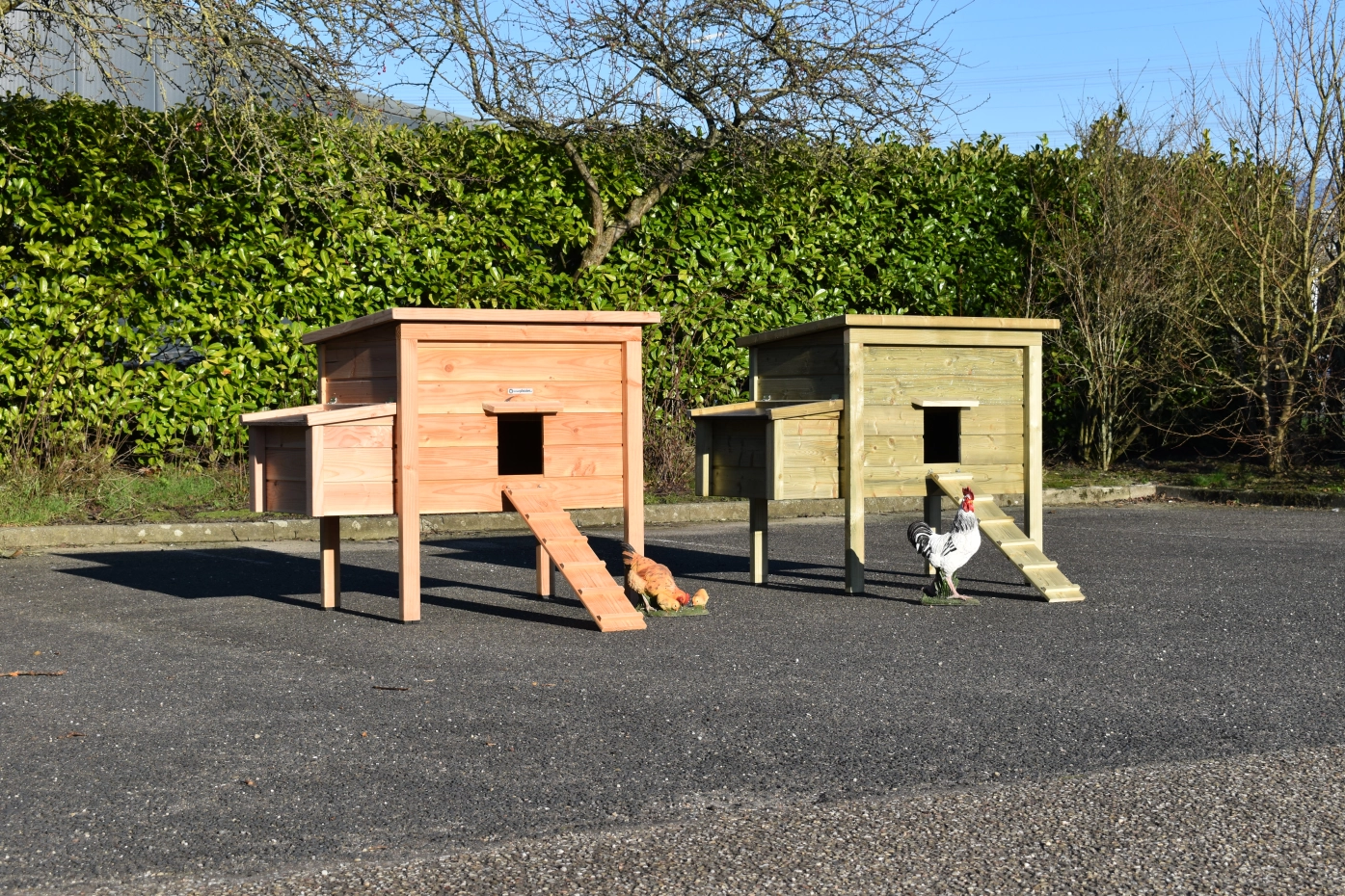 Kippenhok Chicky 2 met legnest is een praktisch en stevig kippenhok, voor het houden van kippen die in een ren of los mogen lopen. Goede toegankelijkheid door de dakjes die open kunnen scharnieren. Omdat het kippenhok hoog op de poten staat kunnen de kippen er ook onder schuilen, of u kunt het voer er onder zetten.