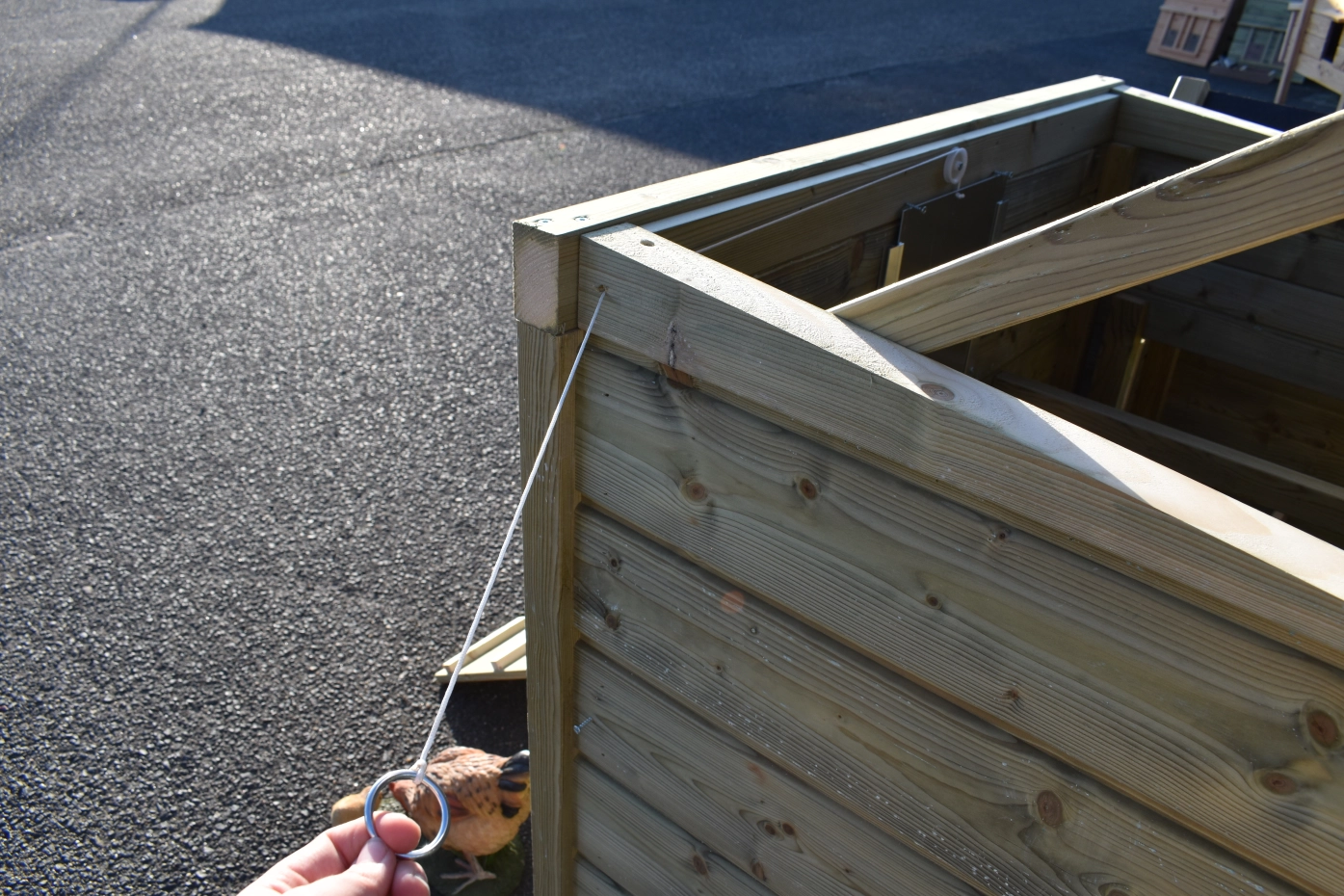 - Wanneer het hok niet op een beschutte plaats staat, dan adviseren wij om het te verankeren