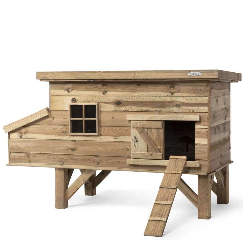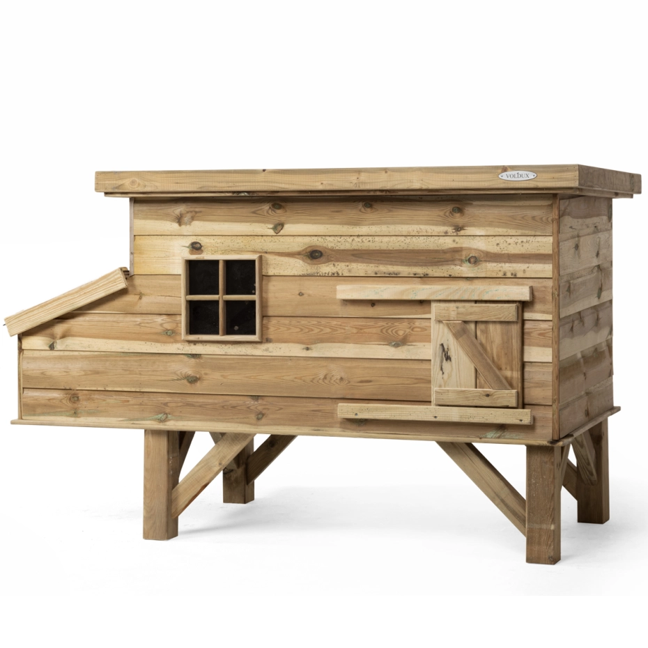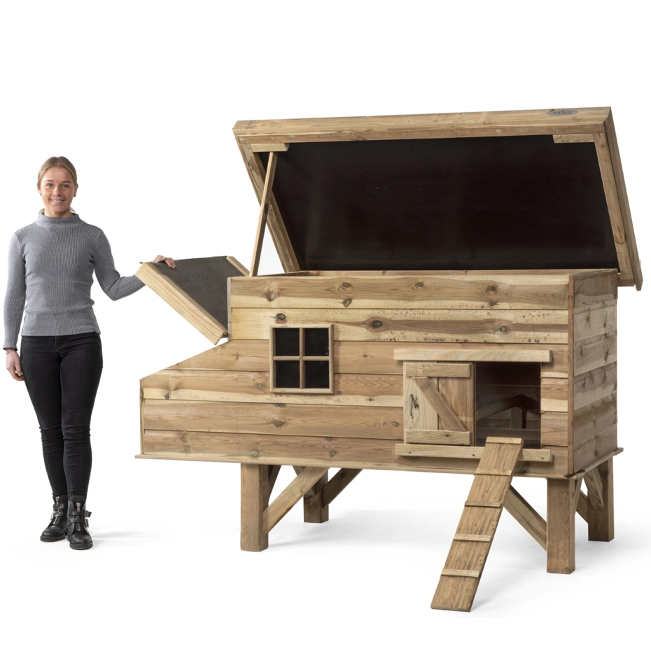 Dit luxe kippenhok kan perfect gebruikt worden als nachtverblijf in jouw kippenren of dieren ren. Het grote nachthok voor kippen is gemaakt van geïmpregneerd hout dit zorgt ervoor dat het kippenhok onderhoudsvrij is en geen jaarlijkse beits of schilder beurt vraagt. Dit prachtige kippenhok heeft een afmeting van 190x88x110cm en biedt ruimte aan meerdere kippen. Het verblijf is verhoogd waardoor het meer warmte en comfort biedt aan de kippen tijdens koudere dagen. Het nachthok is voorzien van een zitstok voor de nacht en een af te sluiten deur, waarmee je de kippen in de nacht kunt beschermen tegen roofdieren. Het legnest beschikt over van een open te klappen dakje, hierdoor hoef je het hok niet te betreden voor het rapen van eieren. Dit kippen nachthok wordt handmatig geproduceerd en wordt (gedeeltelijk) bij je thuis afgeleverd.
