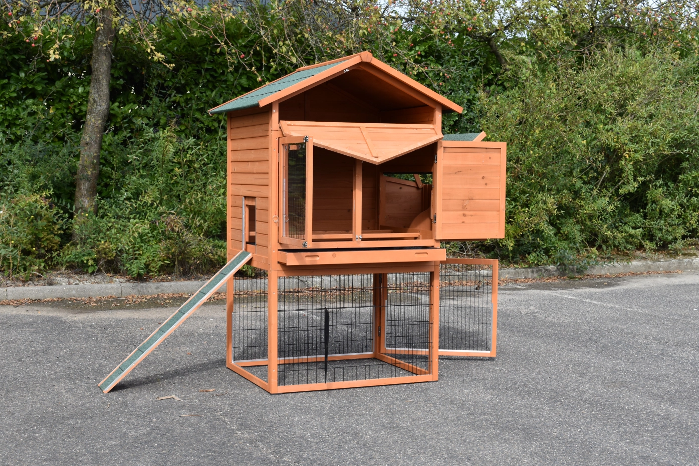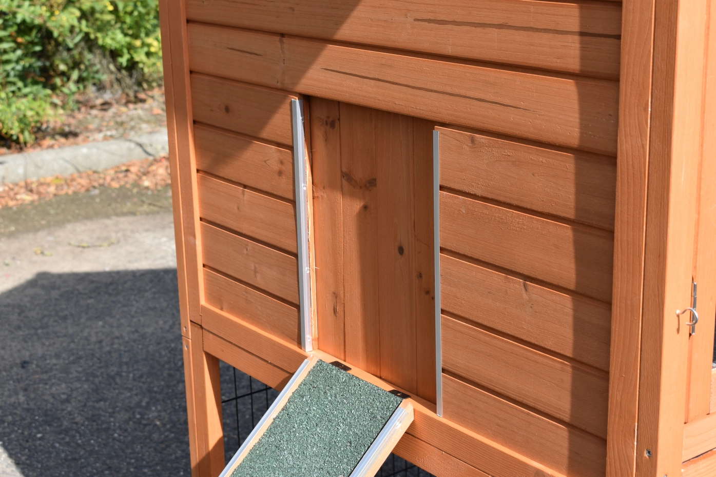 - Wanneer het hok niet op een beschutte plaats staat, dan adviseren wij om het te verankeren