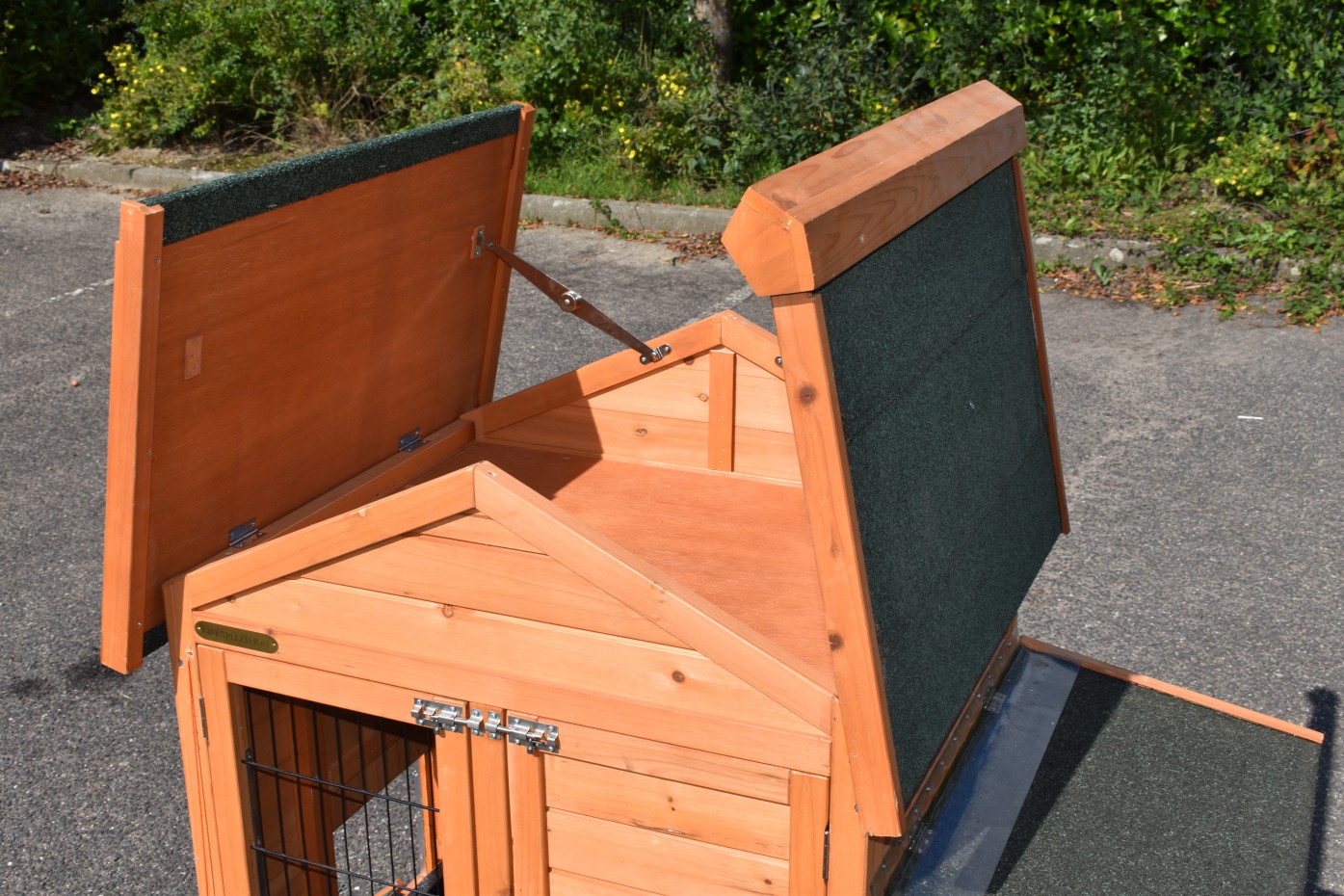 - Het hok heeft een dak met dakleer