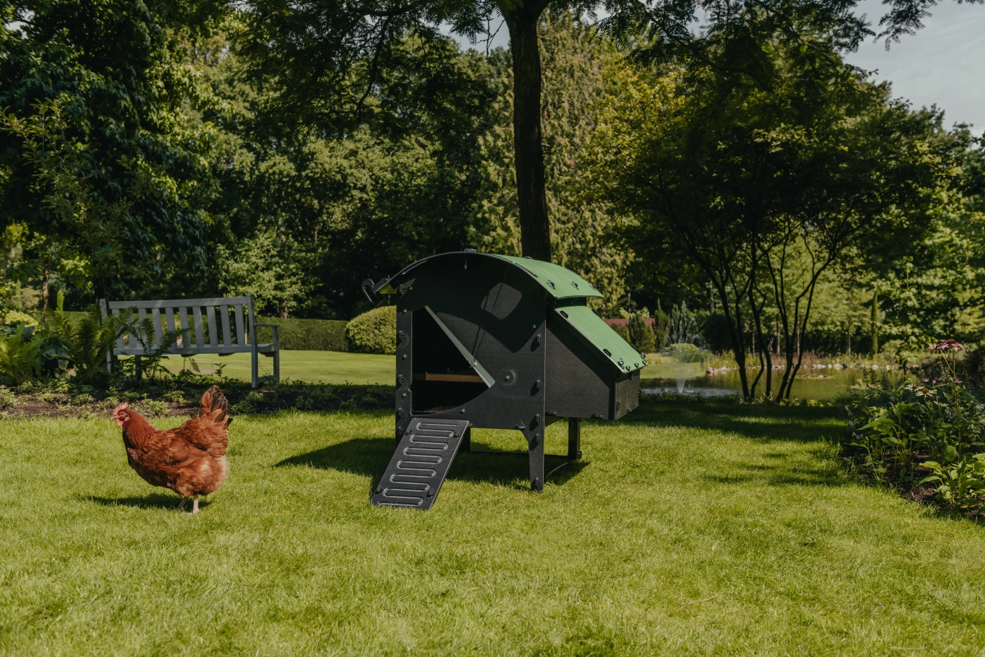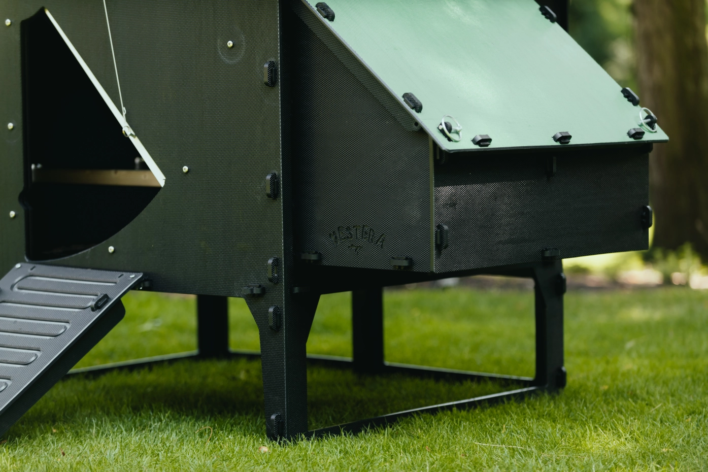 Dit Nestera kippenhok is gemaakt van gerecycled plastic. De kunststof kippenhokken kunnen makkelijk schoongemaakt worden met een tuinslang, hogedrukreiniger o.i.d. De hokken drogen erg snel, ook kan hok makkelijk ge(de)monteerd worden. Omdat het hok alleen maar gladde kunststof onderdelen heeft, kunnen de bloedluizen ook niet in het hok schuilen. Het kunststof kippenhok van Nestera staat op poten, zodat uw kippen eronder kunnen schuilen. De kippenhokken van kunststof zijn onderhoudsvrij.