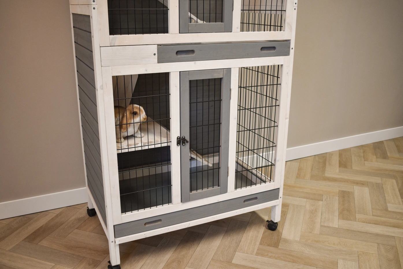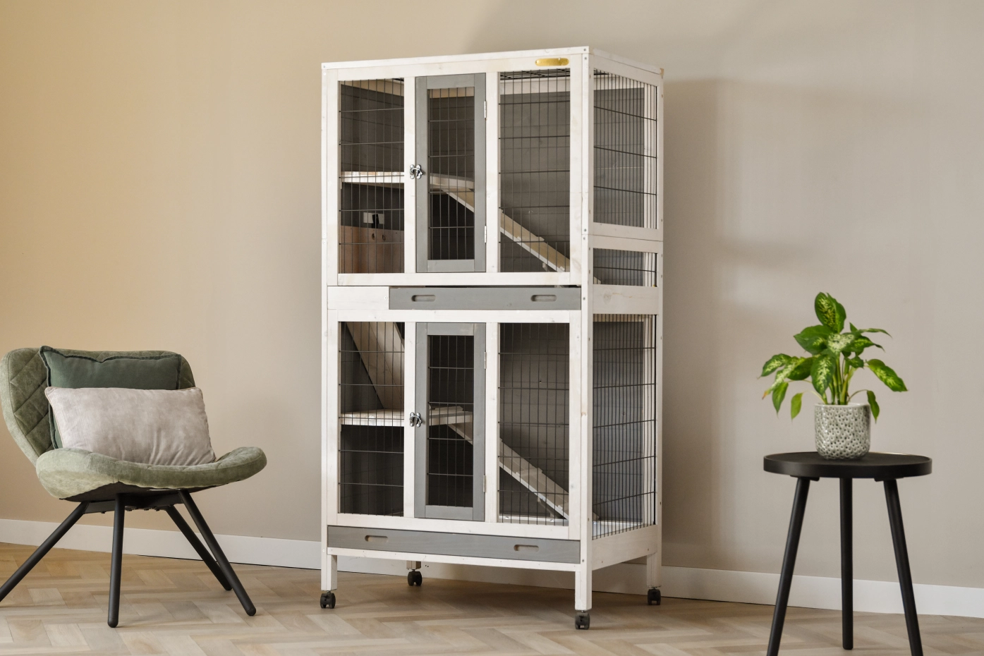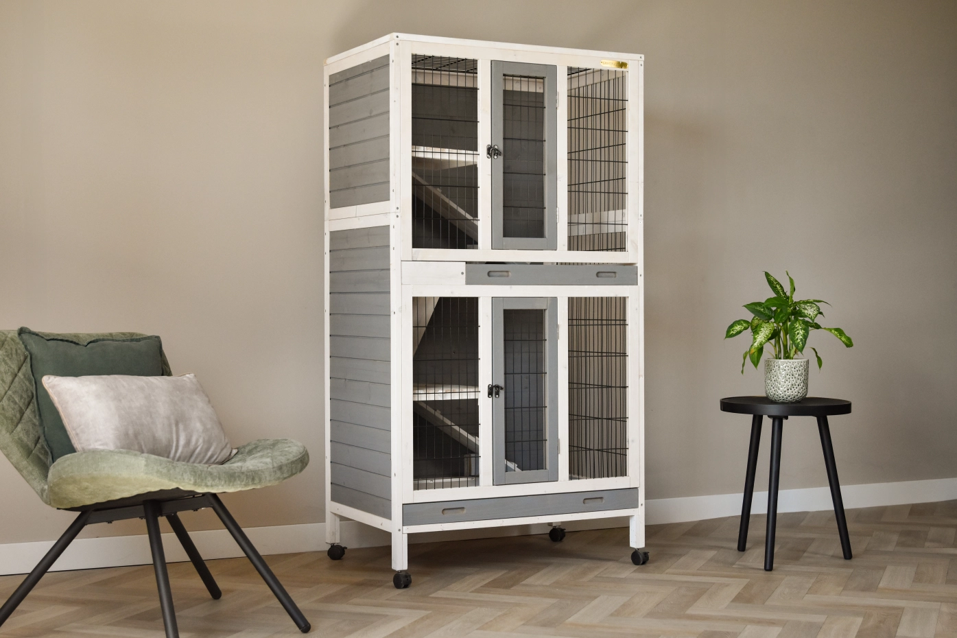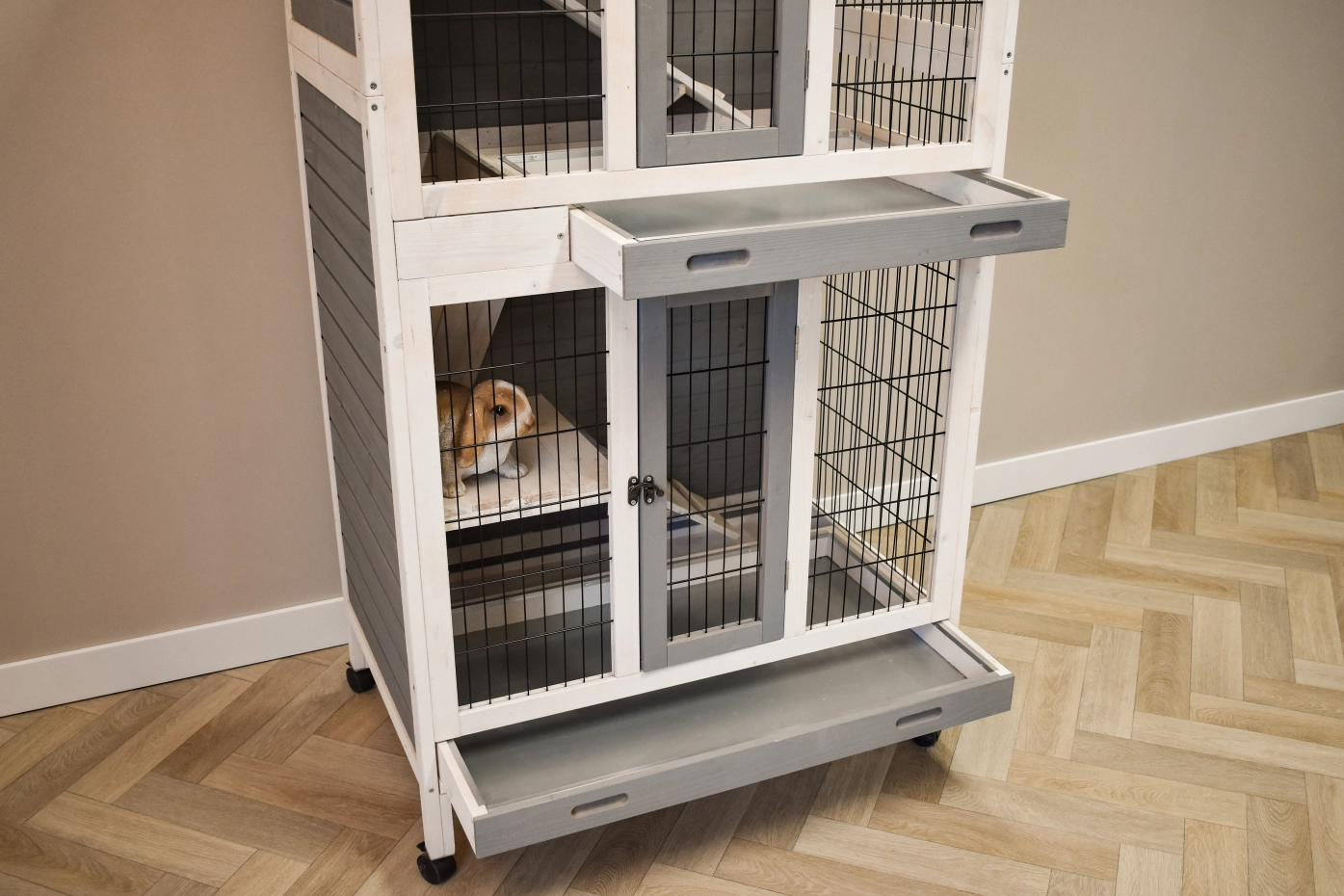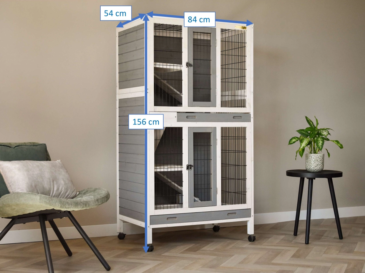 De konijnenkooi Beau heeft meerdere etages, wat het tot een speels verblijf maakt voor uw konijnen. De kooi heeft twee schuiflades, zodat het makkelijk te reinigen is. Kleurcombinatie wijkt licht af van de foto’s.