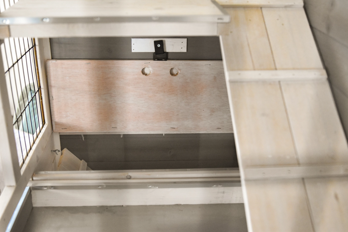 - Metalen schuiflade (zink) om het hok handig schoon te maken