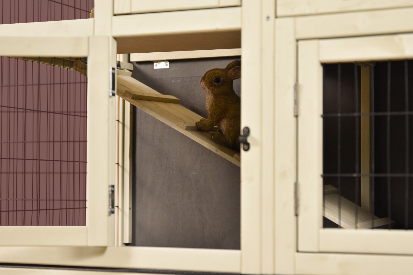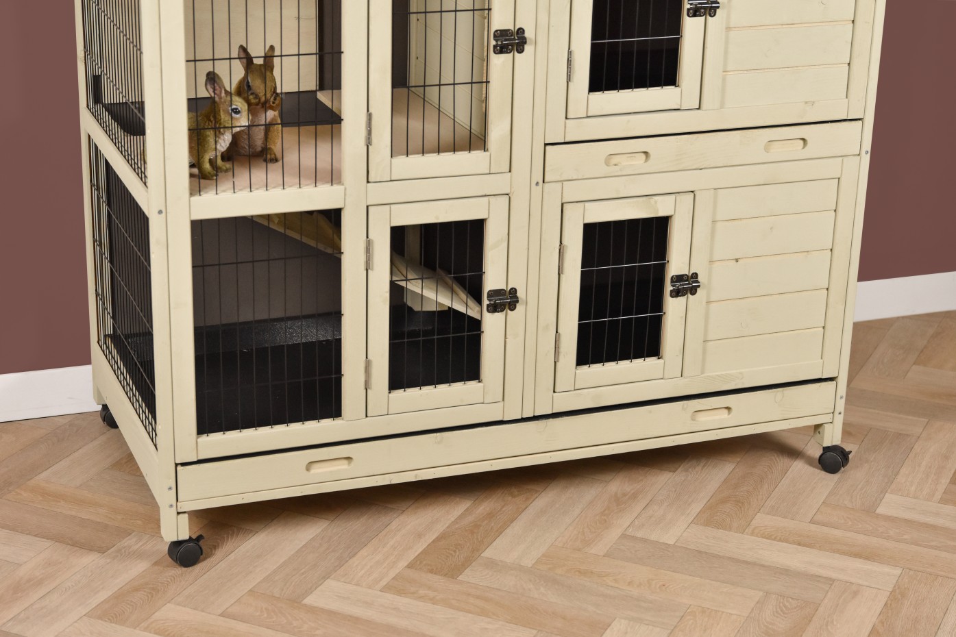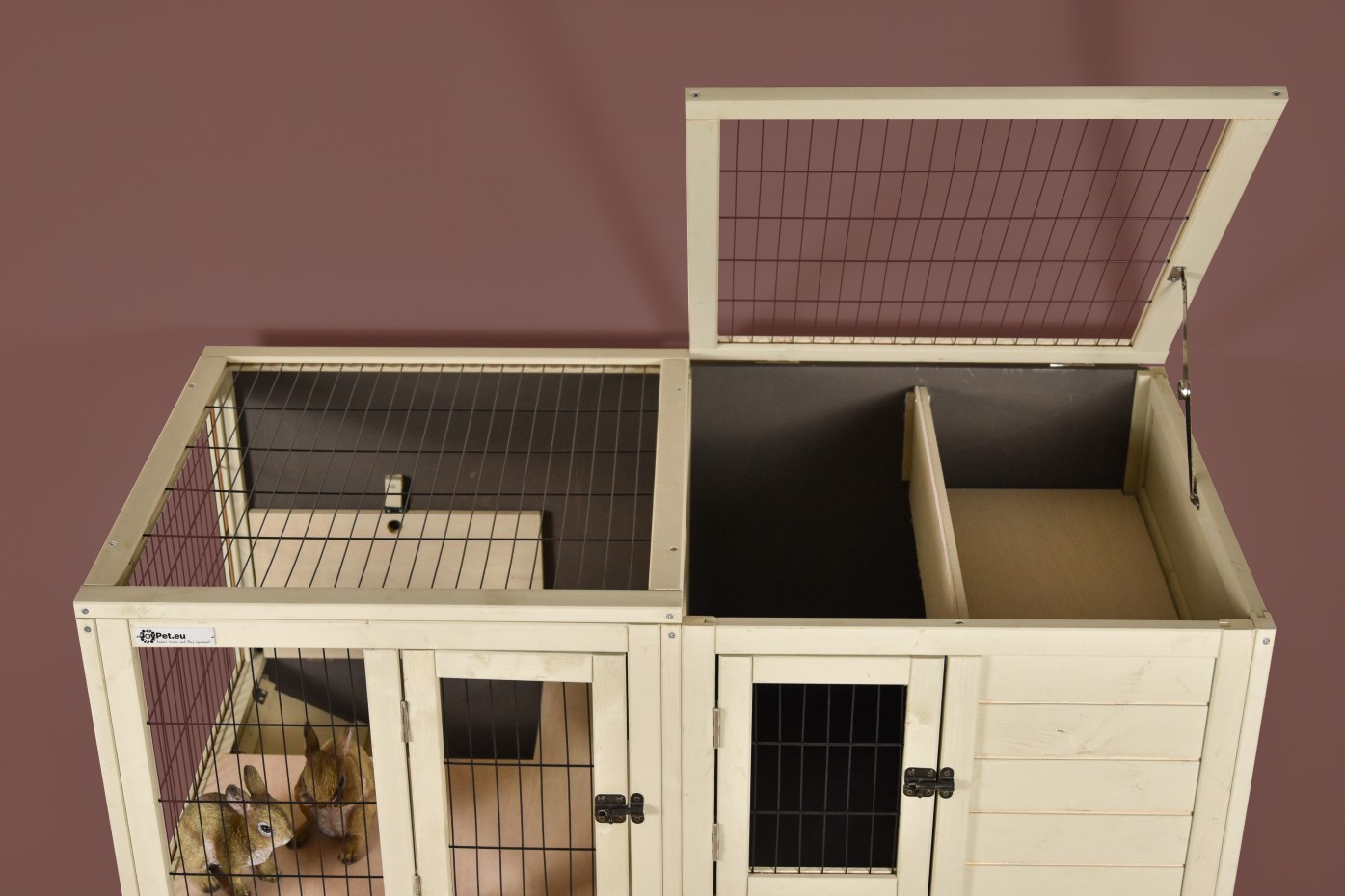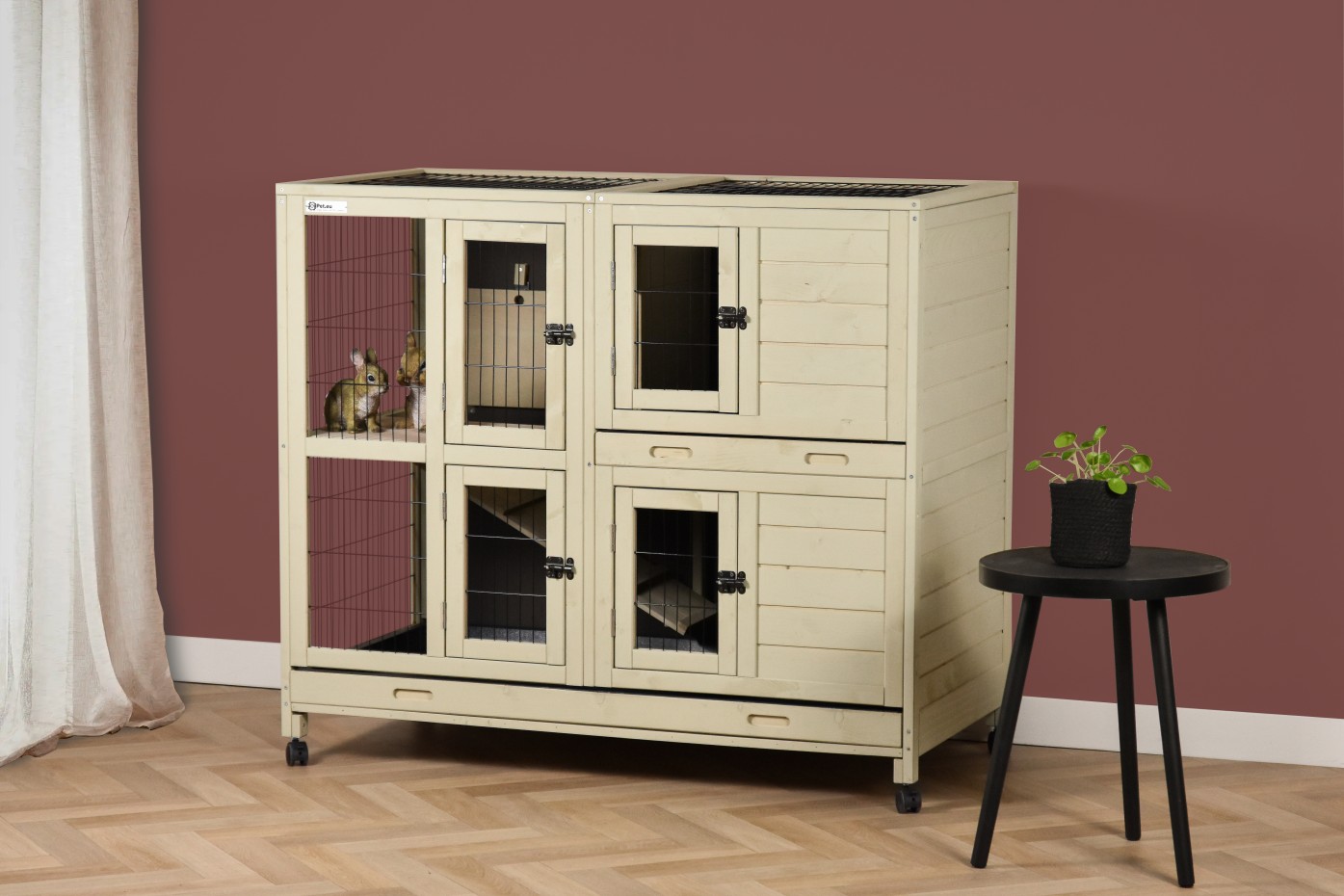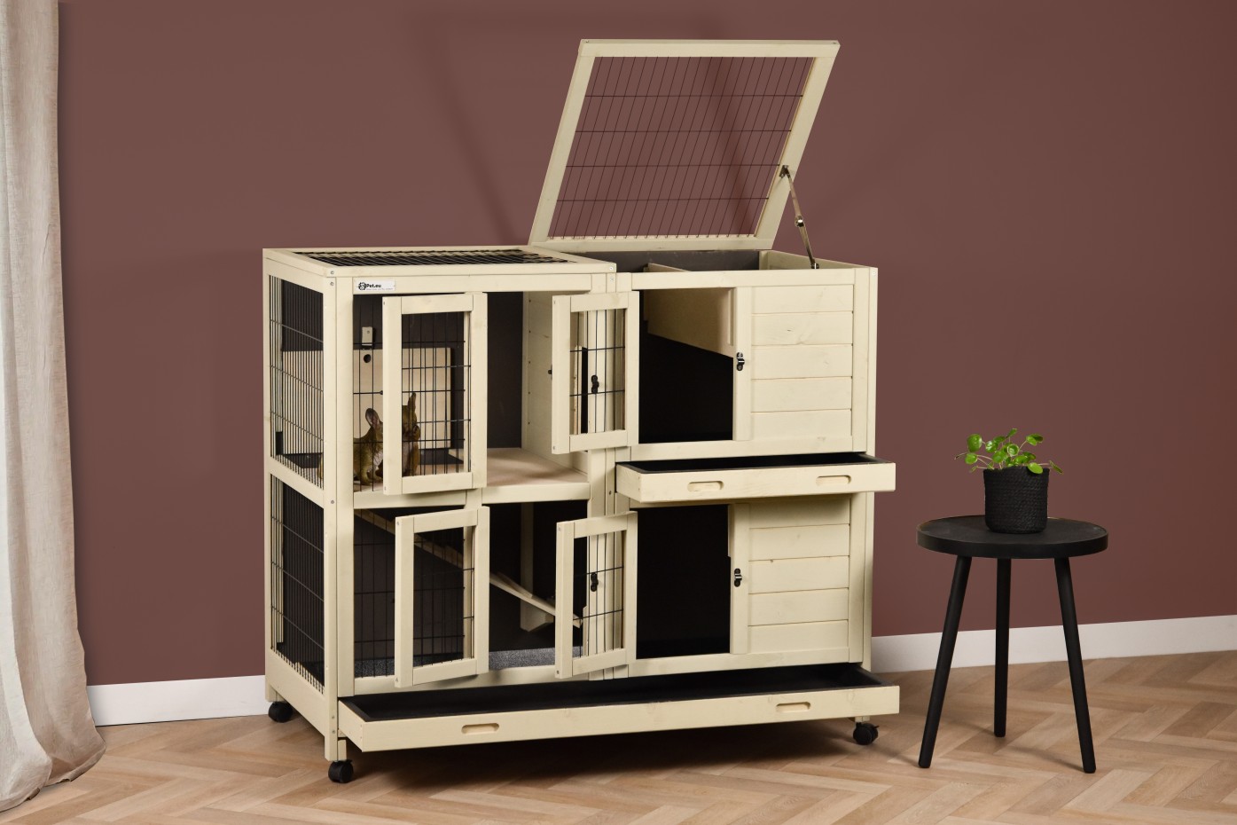 Konijnenhok Bobby is een stijlvol binnenhok gemaakt van mooi dennenhout en gebeitst in een rustige zandbeige kleur. De achterwand heeft een warme antraciet tint, wat het hok een moderne en harmonieuze uitstraling geeft. Bobby biedt ruimte aan twee konijnen en beschikt over een praktisch nachthok met daarboven een handige opbergzolder. Via de loopplank kunnen de konijnen eenvoudig naar boven lopen. De twee niveaus zijn afsluitbaar van elkaar, zodat u het verblijf altijd flexibel kunt indelen.