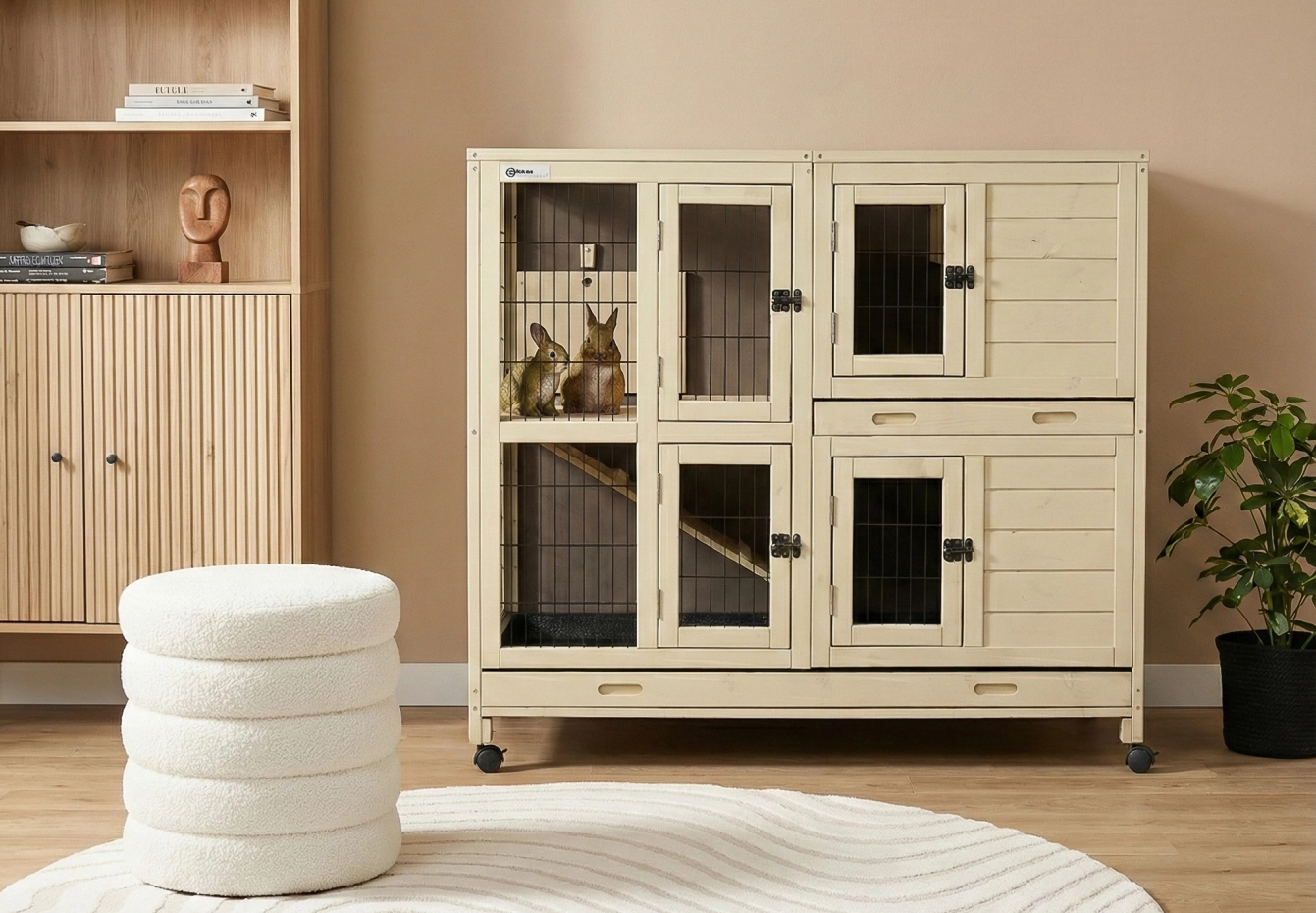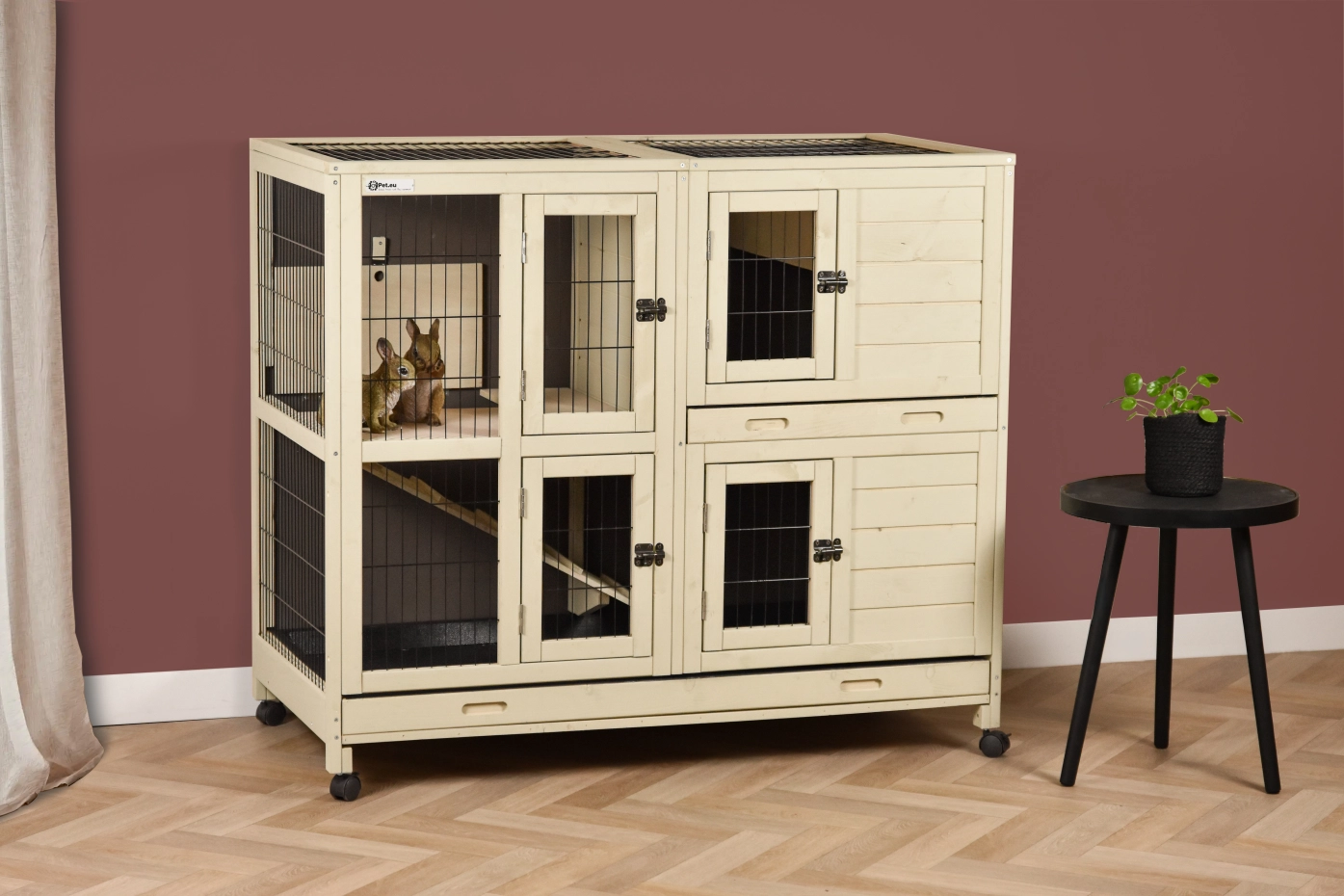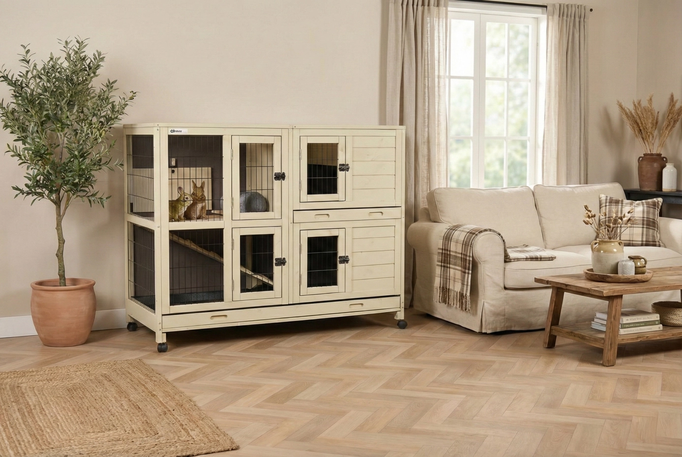 Konijnenhok Bobby is een stijlvolle binnenkooi die in bijna ieder interieur past. Dit stevige binnenhok is gemaakt van dennenhout en gebeitst in een rustige zandbeige kleur met antraciet achterwand. Door de twee stevige en diepe mestlades is het makkelijk schoon te houden en dus ideaal voor binnen gebruik. Bobby biedt ruimte aan meerdere konijnen en beschikt over een praktisch nachthok met daarboven een handige berging. Via de loopplank kunnen de konijnen eenvoudig naar boven lopen. De twee niveaus zijn afsluitbaar van elkaar, zodat u het verblijf altijd flexibel kunt indelen.
