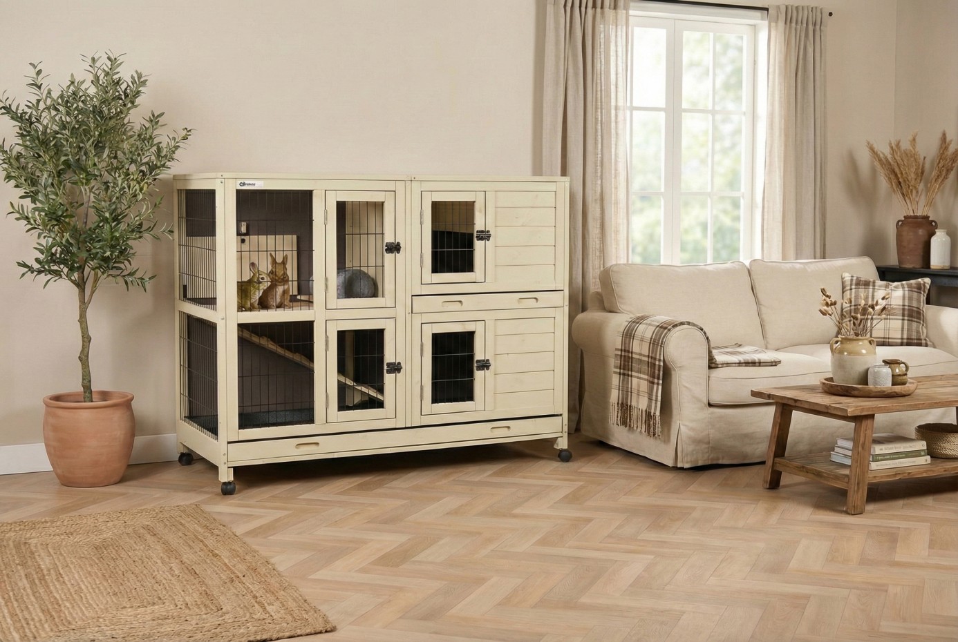 Konijnenhok Bobby is een stijlvol binnenhok die past binnen veel verschillende huisstijlen. De Bobby is gemaakt van mooi dennenhout en gebeitst in een rustige zandbeige kleur. De achterwand heeft een warme antraciet tint, wat het hok een moderne en harmonieuze uitstraling geeft. Bobby biedt ruimte aan twee konijnen en beschikt over een praktisch nachthok met daarboven een handige opbergzolder. Via de loopplank kunnen de konijnen eenvoudig naar boven lopen. De twee niveaus zijn afsluitbaar van elkaar, zodat u het verblijf altijd flexibel kunt indelen.