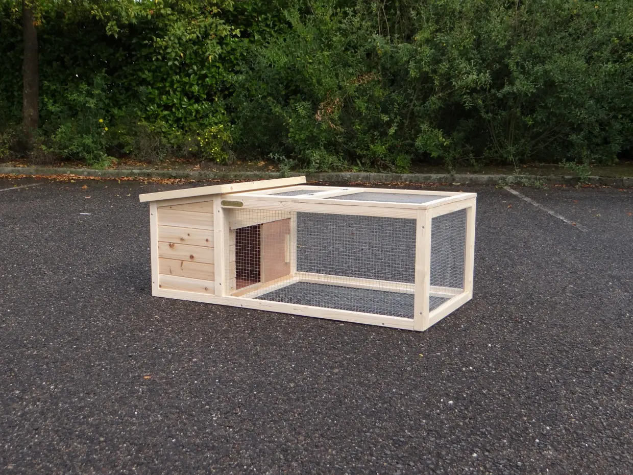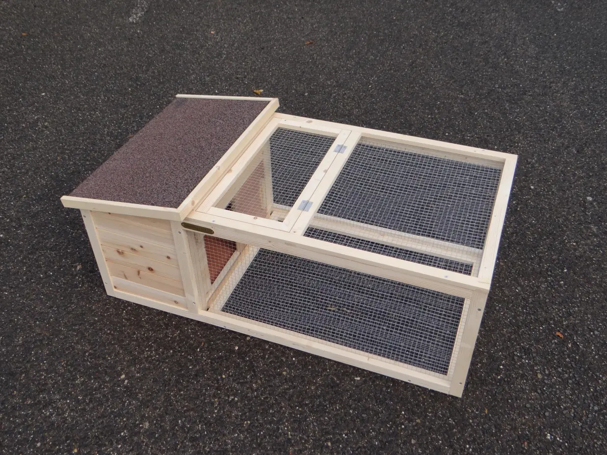 Het kleine konijnenhok Lily is geschikt om uw dwergkonijn of cavia buiten te laten spelen. Het hok is makkelijk verplaatsbaar. De ren heeft een gaasbodem en een scharnierend dak. Het nachthok heeft een uitneembare houten bodem en een scharnierend dak met dakleer.