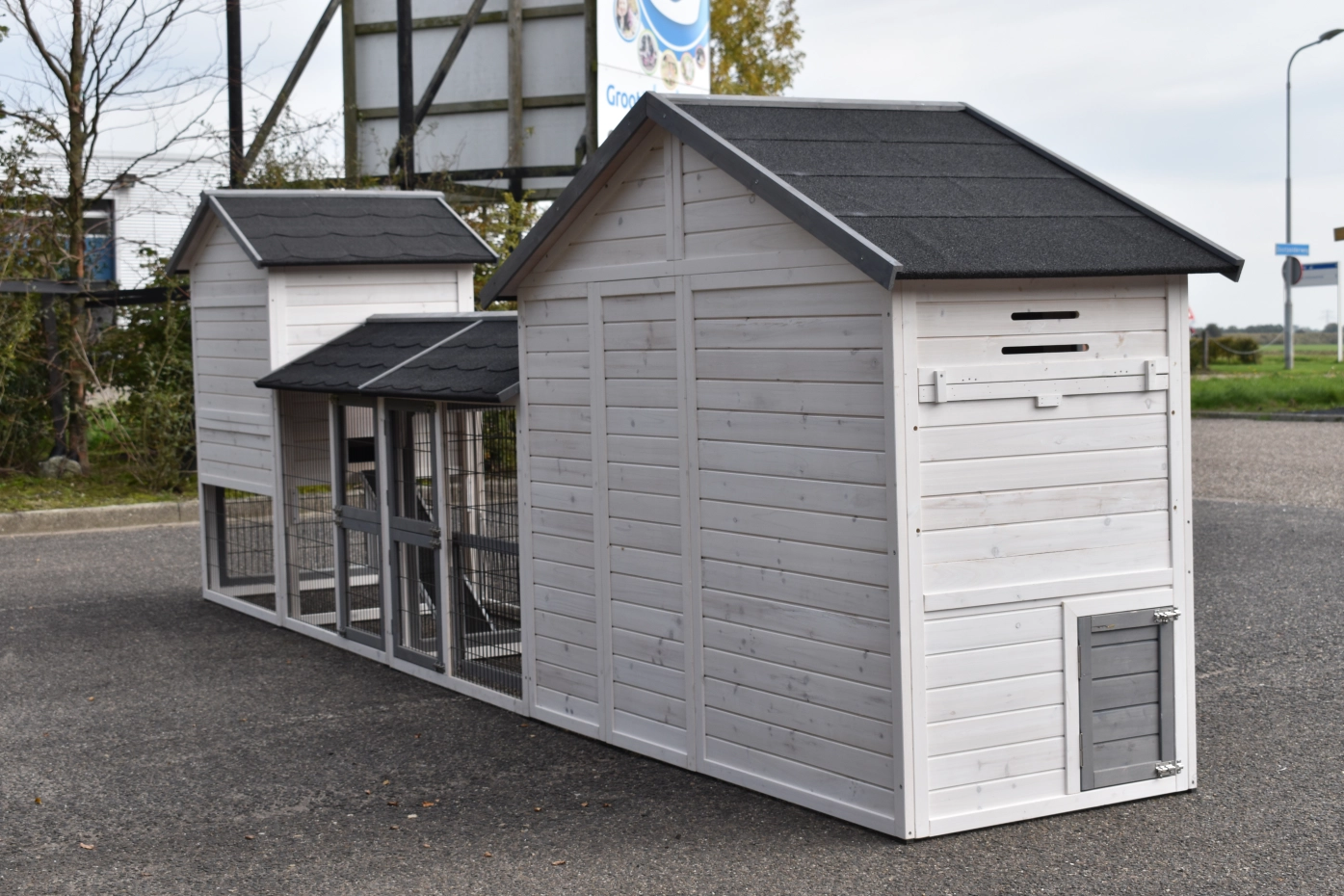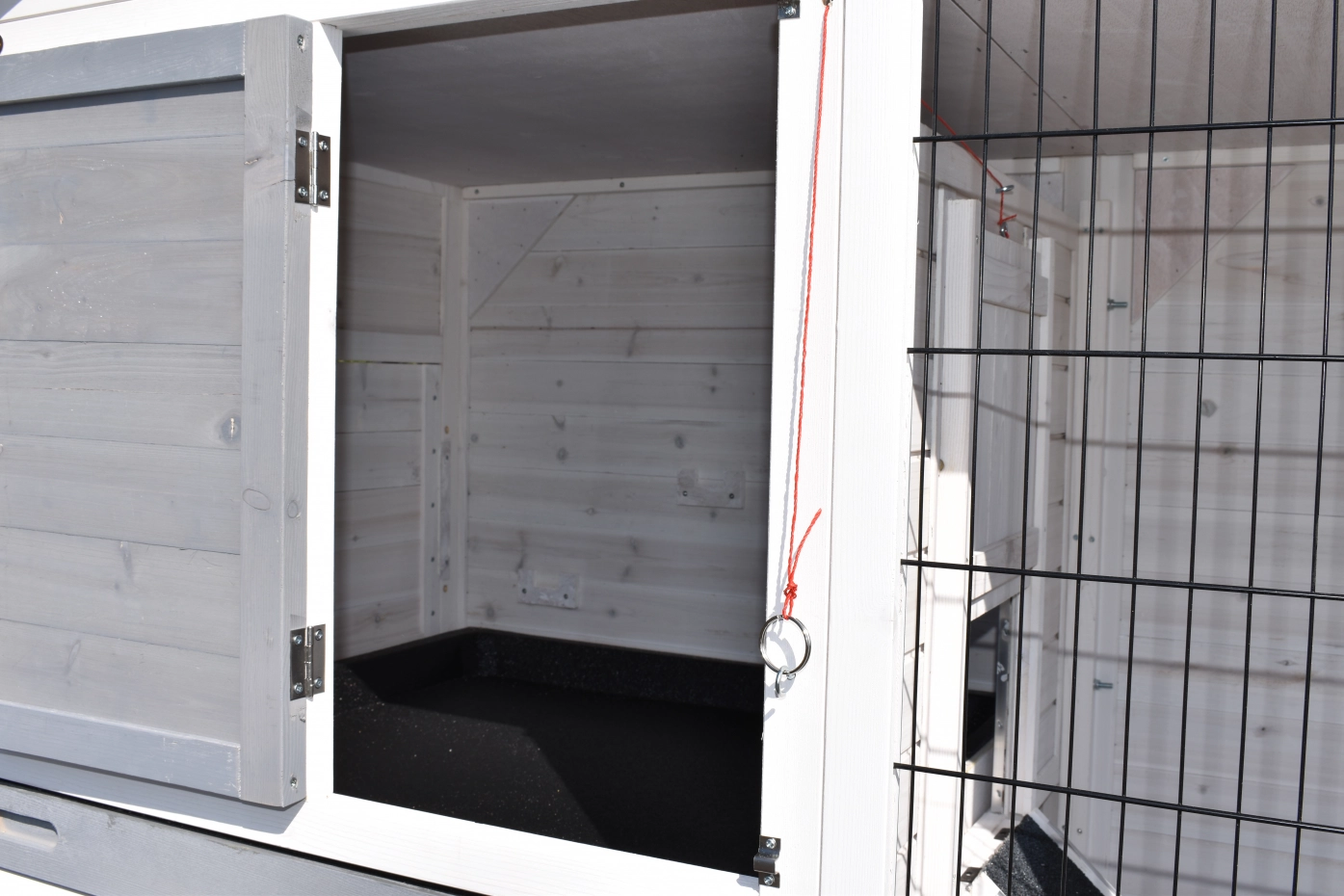 - Wanneer het hok niet op een beschutte plaats staat, dan adviseren wij om het te verankeren