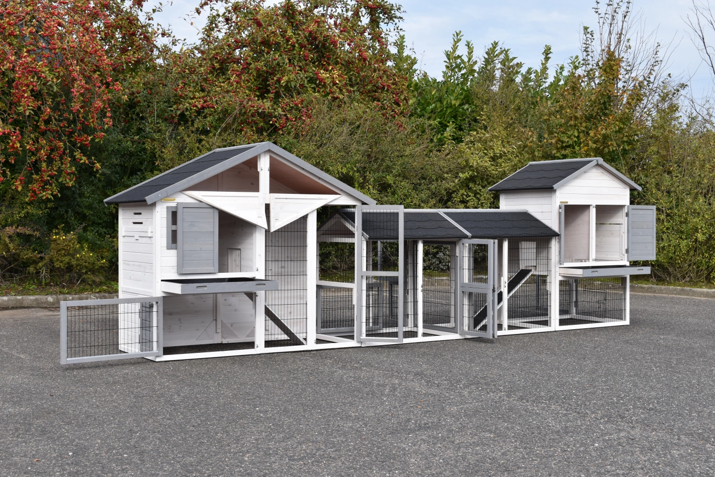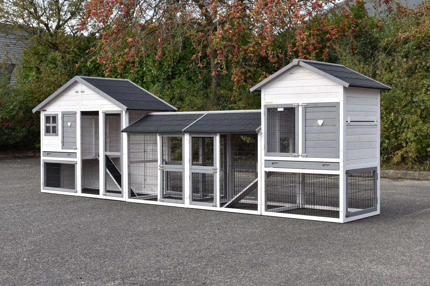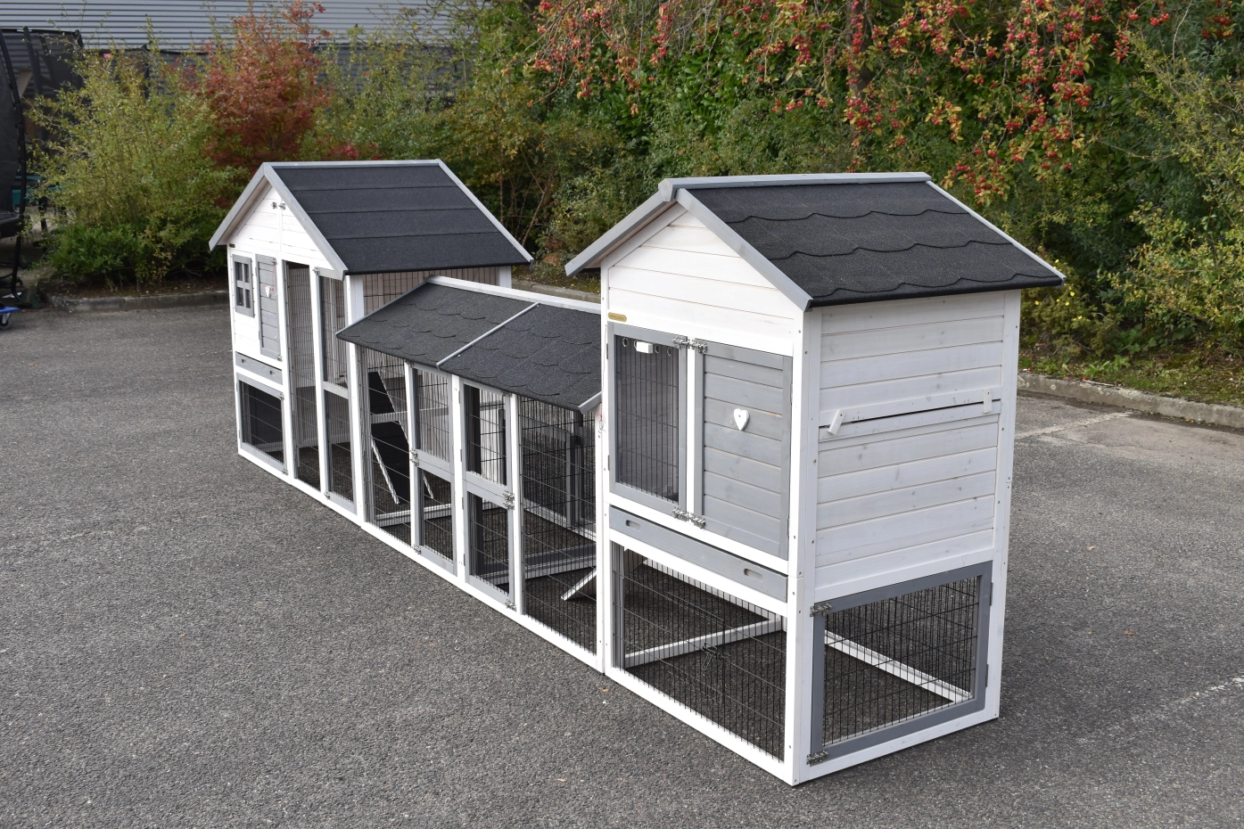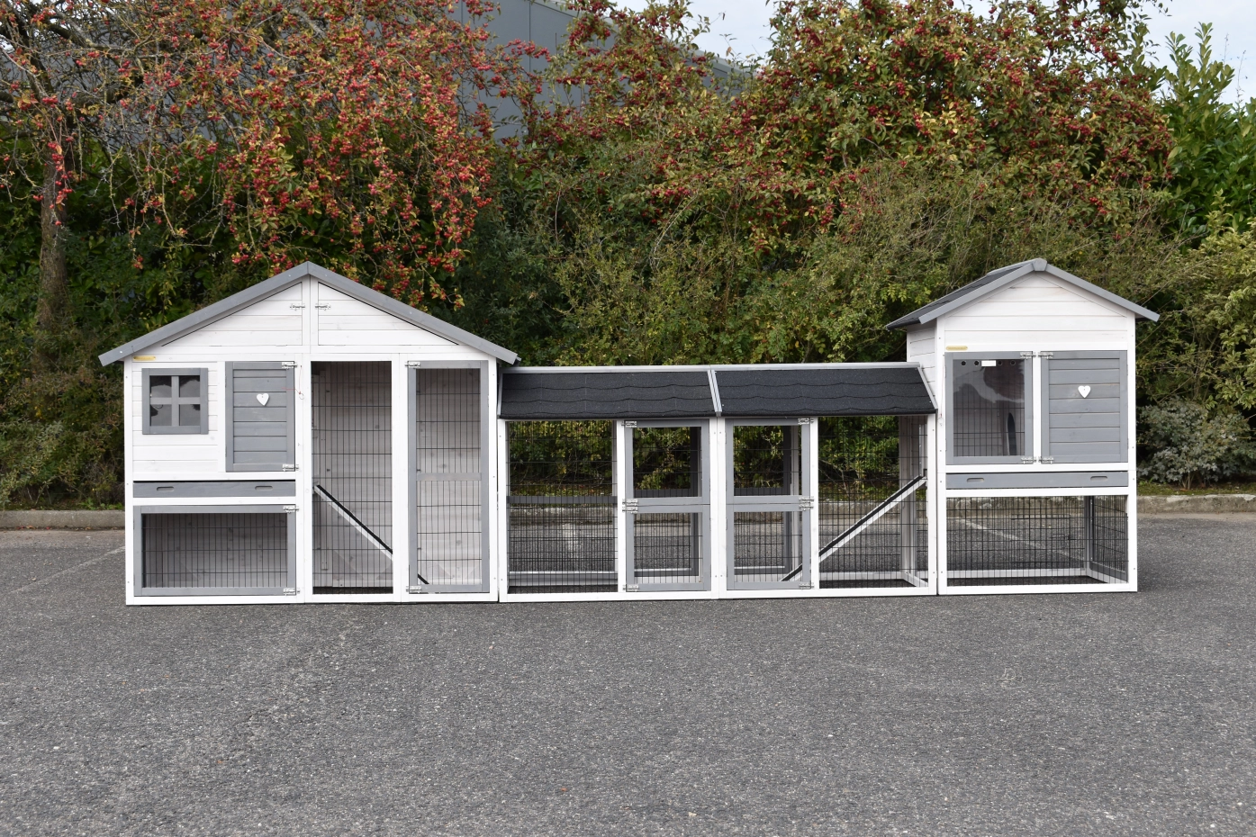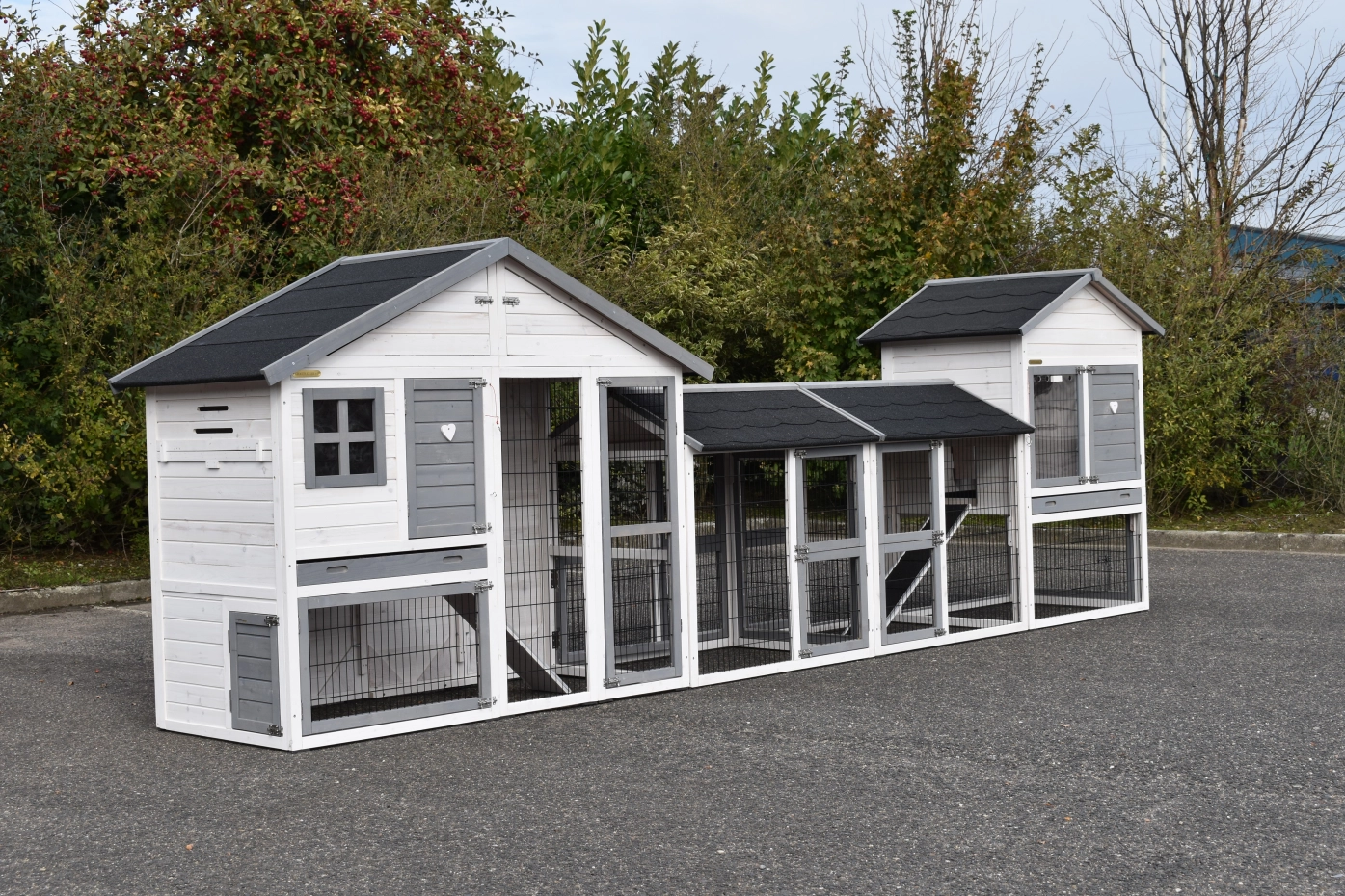 Konijnenhok Holiday Medium is uitgebreid met het hok Prestige Medium en 2 rennen. De grote combinatie is geschikt voor 4 tot 8 konijnen. De beide hokken zijn voorzien van een schuiflade en een bergzolder.