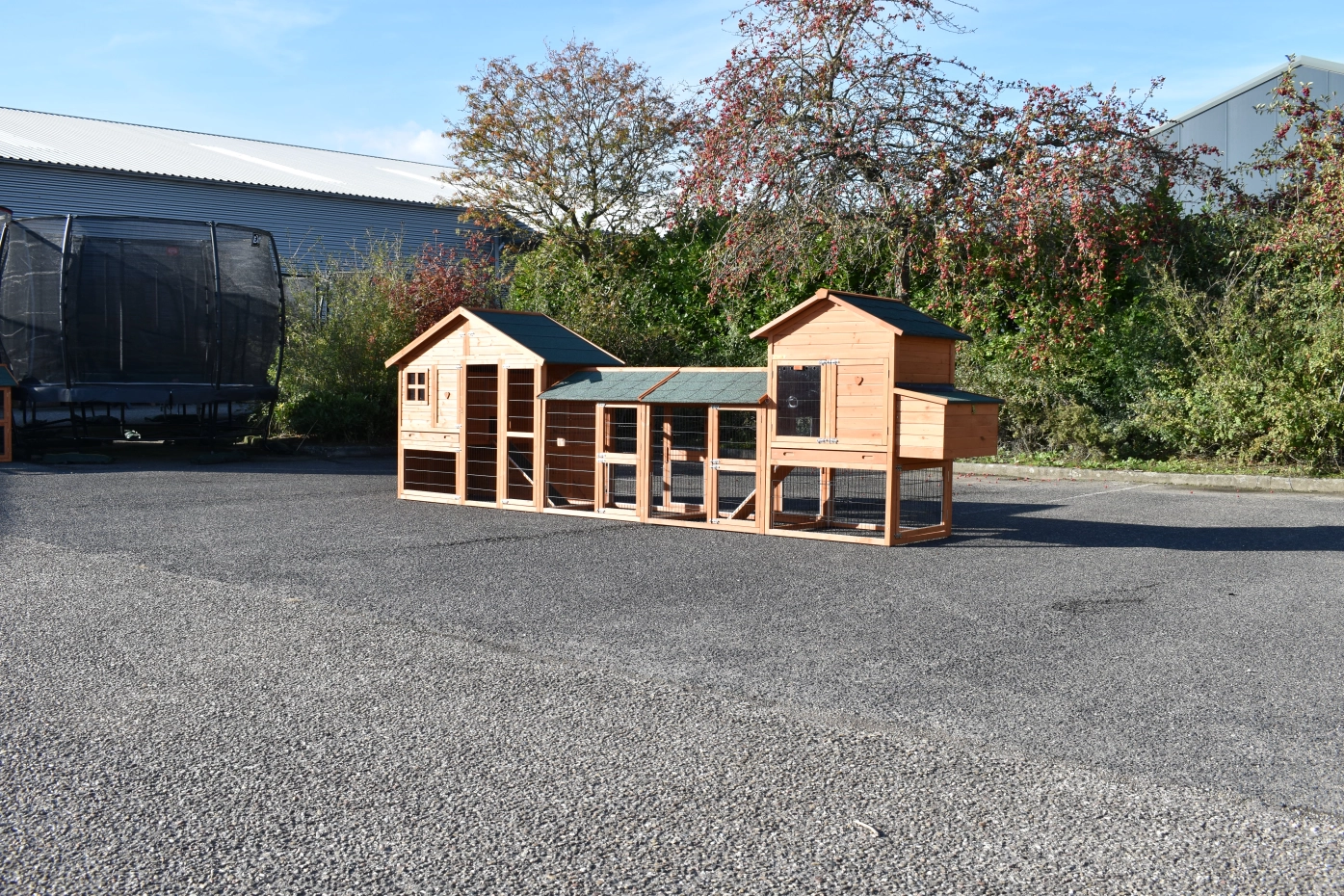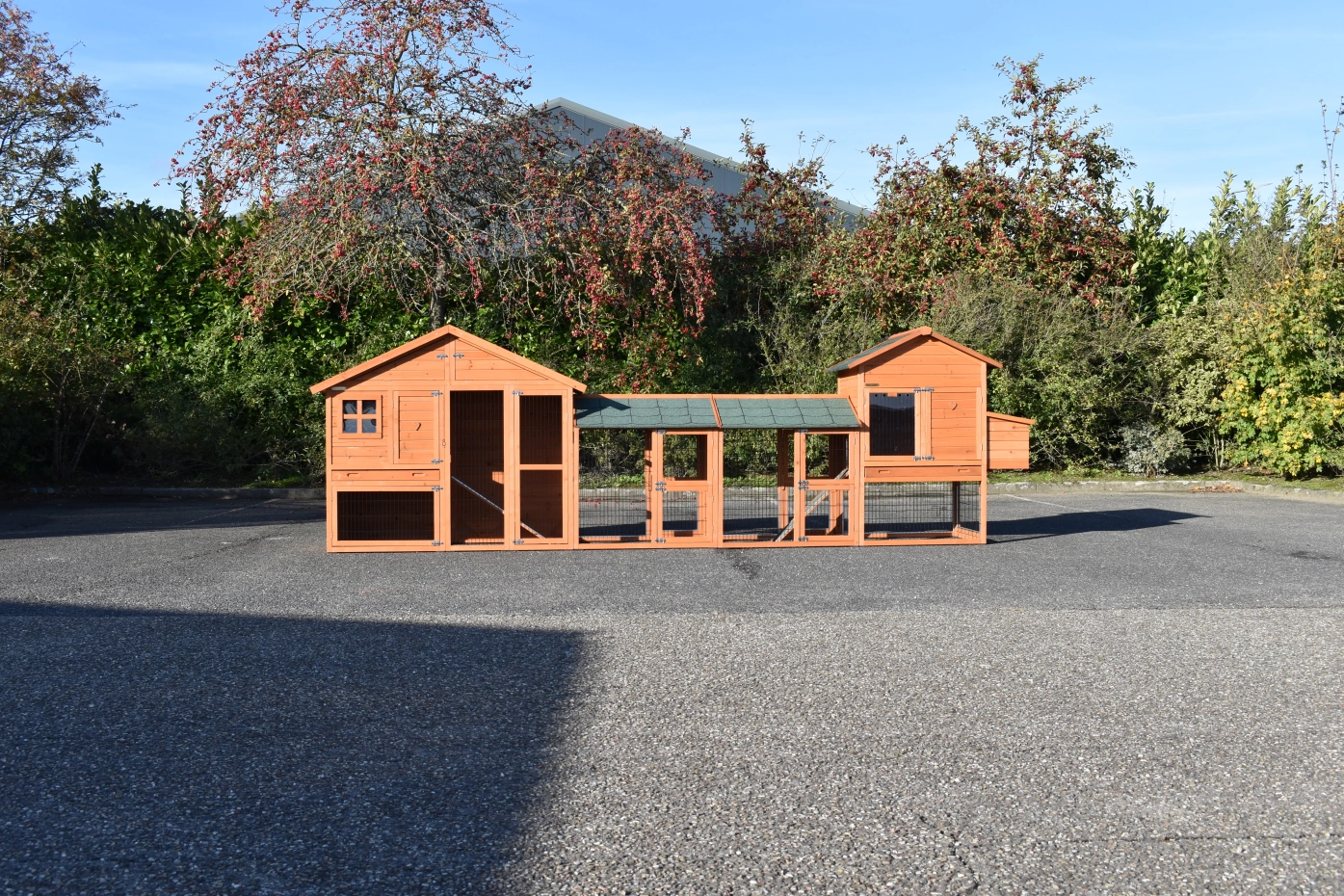 Konijnenhok Holiday Medium met tussenrennen en dierenverblijf Prestige Medium met nestkast is een zeer praktische en mooie konijnenhokkencombinatie met 2 nachthokken en een ruime ren. Deze combinatie is geschikt voor het huisvesten van grote konijnen, zoals franse hangoren, vlaamse reuzen, andere grote rassen of een groepje konijnen. Deze grote combinatie is geschikt voor 4-8 konijnen, afhankelijk van het ras.