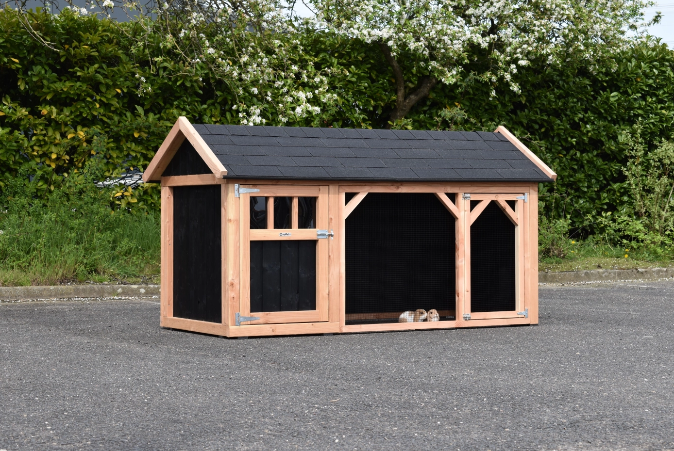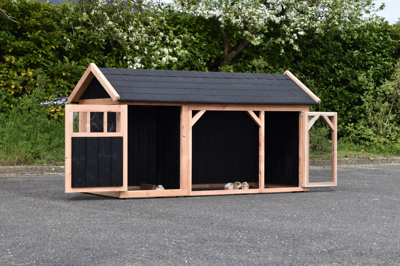 Konijnenhok Belle 1 met puntdak is een prachtig en stevig konijnenhok met ruime ren. Doordat deze Belle 1 versie alleen aan de voorkant een opening heeft, hebben konijnen veel beschutting tegen wind en weersinvloeden. Het beschutte nachthok heeft een douglas houten bodem en een ruime deur. Dit wordt bij ons zelf gemaakt van goede kwaliteit materialen. Hierdoor is het erg onderhoudsvrij en stevig.