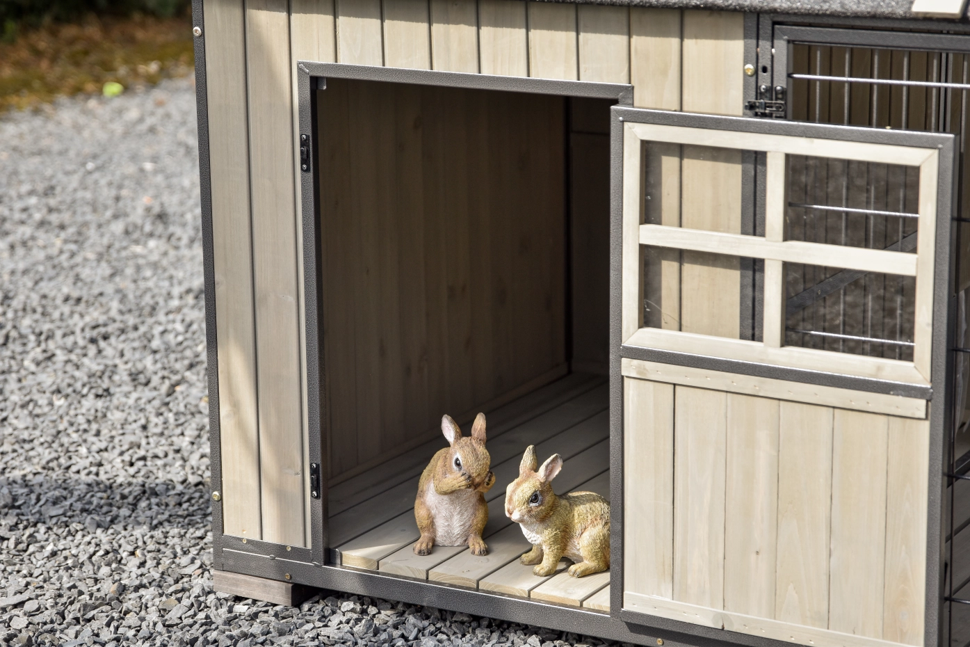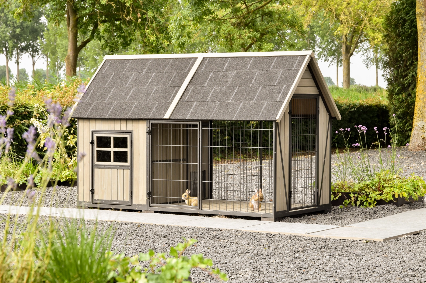 Met zijn karakteristieke puntdak, drie toegangsdeuren en houten vloer is dit konijnenhok niet alleen praktisch, maar ook prettig in gebruik. Het ruime nachthok biedt beschutting en rust, terwijl de royale ren volop ruimte geeft om te bewegen en te springen. Dit hok is geschikt voor 6 kleine konijnen, 4 middelgrote of 2 grote konijnen – een fijn en overzichtelijk verblijf voor ieder konijn!
