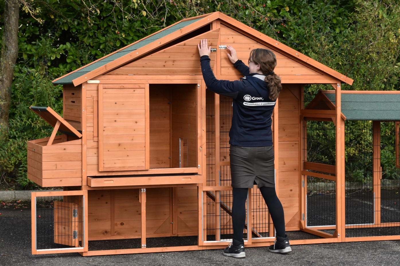 - Wanneer het hok niet op een beschutte plaats staat, dan adviseren wij om het te verankeren