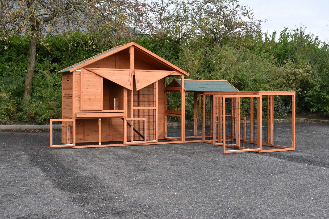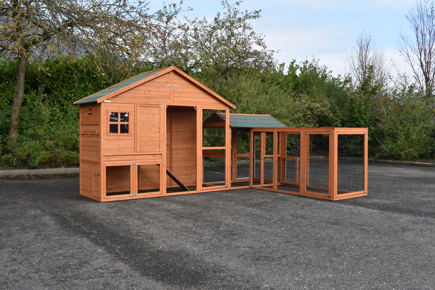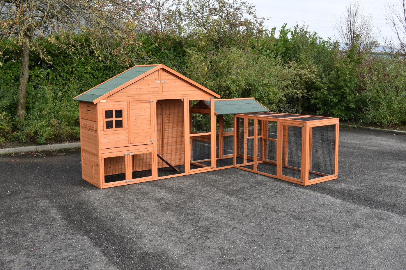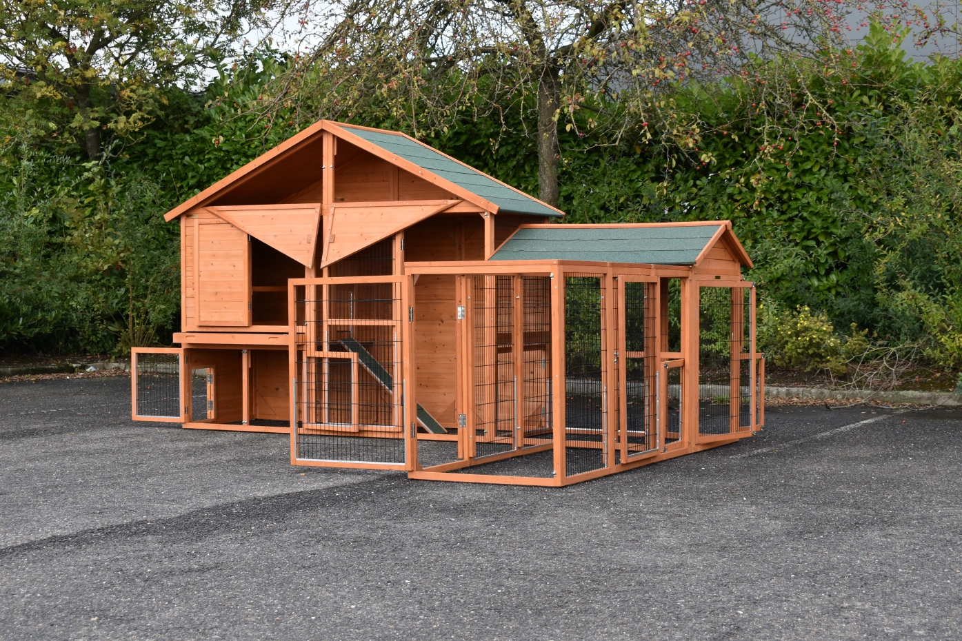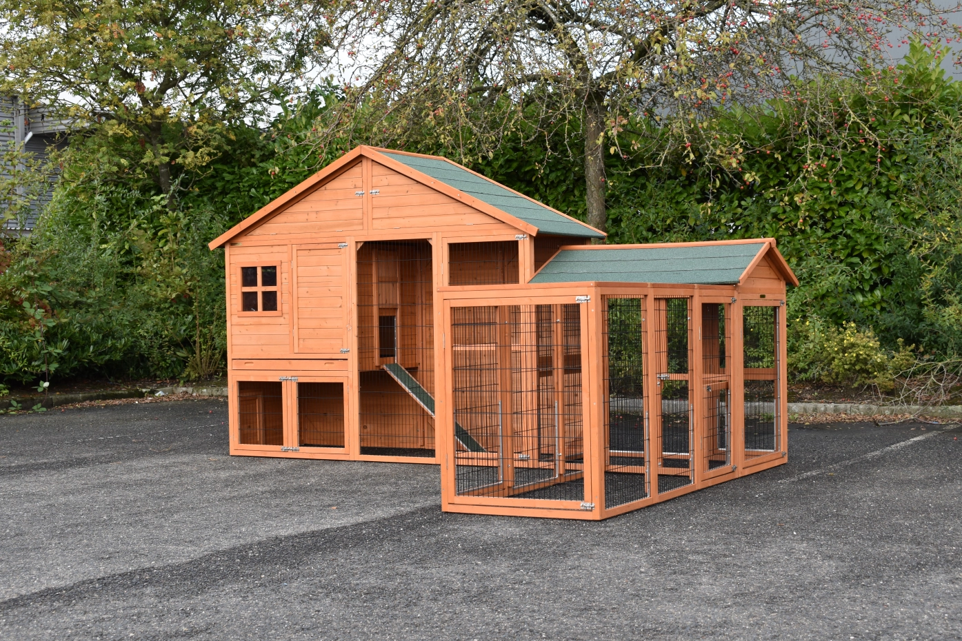 Konijnenhok Holiday Large met de rennen Space Large en Functional is een zeer praktisch, ruim en mooi konijnenhok van uitgekiende kwaliteit. Door de praktische hoekopstelling kan het ruime konijnenhok op een beperkte ruimte geplaatst worden. Dit hok is geschikt voor zo'n 3 tot 5 konijnen. Het konijnenhok heeft een dichte achterwand wat extra beschutting biedt. Het hok kan prima in een hoekopstelling geplaatst worden.