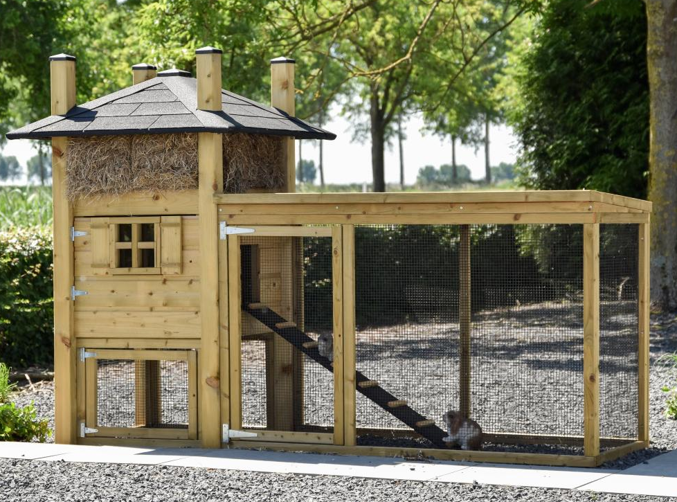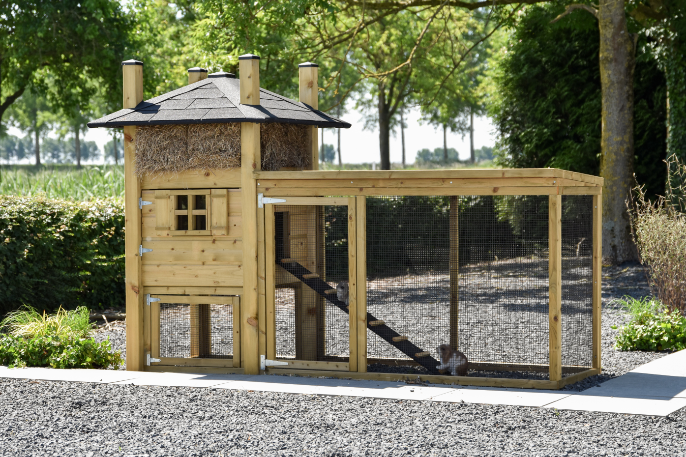 Konijnenhok hooiberg Rosa met ren is een mooi landelijk hok. Het sfeervolle ontwerp maakt je tuin een stuk gezelliger en geeft u een gevoel van landelijk wonen. Aan het hok zit een ruime ren met plat dakleer dak en een ruime deuropening. In het konijnenhok zit een brede deur voor een gemakkelijke schoonmaak.