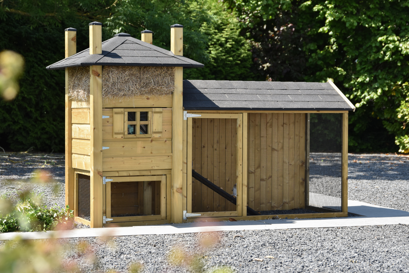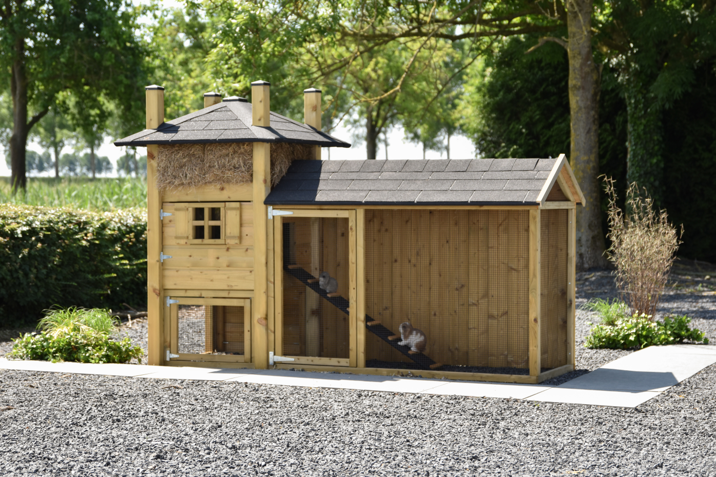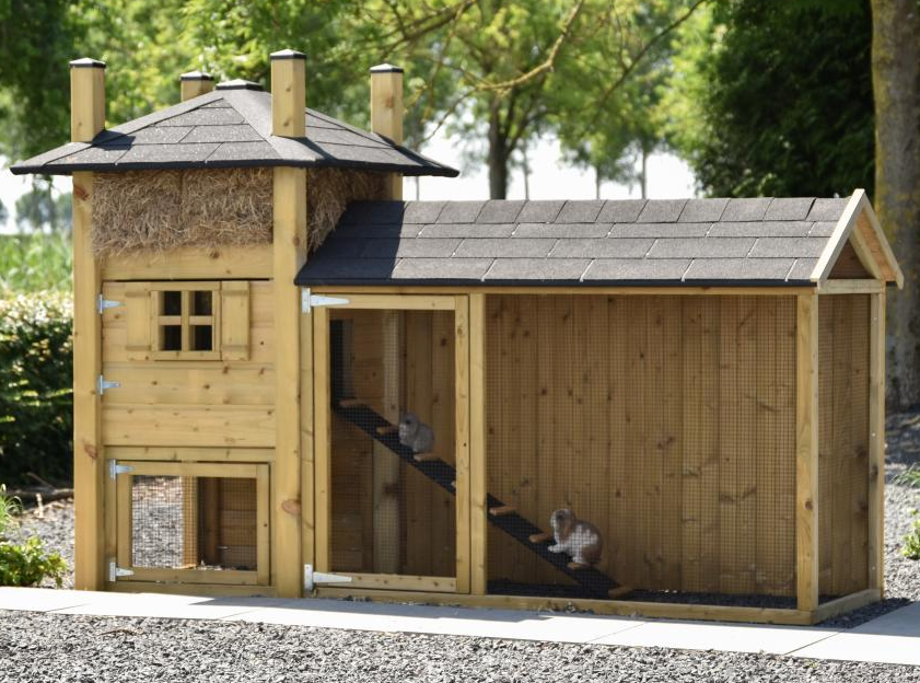 Konijnenhok hooiberg Rosa met ren is een mooi landelijk hok. Het sfeervolle ontwerp maakt je tuin een stuk gezelliger en geeft u een gevoel van landelijk wonen. Aan het hok zit een ruime ren met puntdak en een ruime deuropening. In het konijnenhok zit een brede deur voor een gemakkelijke schoonmaak. De achterkant van de ren is dicht zodat de konijnen lekker beschut kunnen rusten.