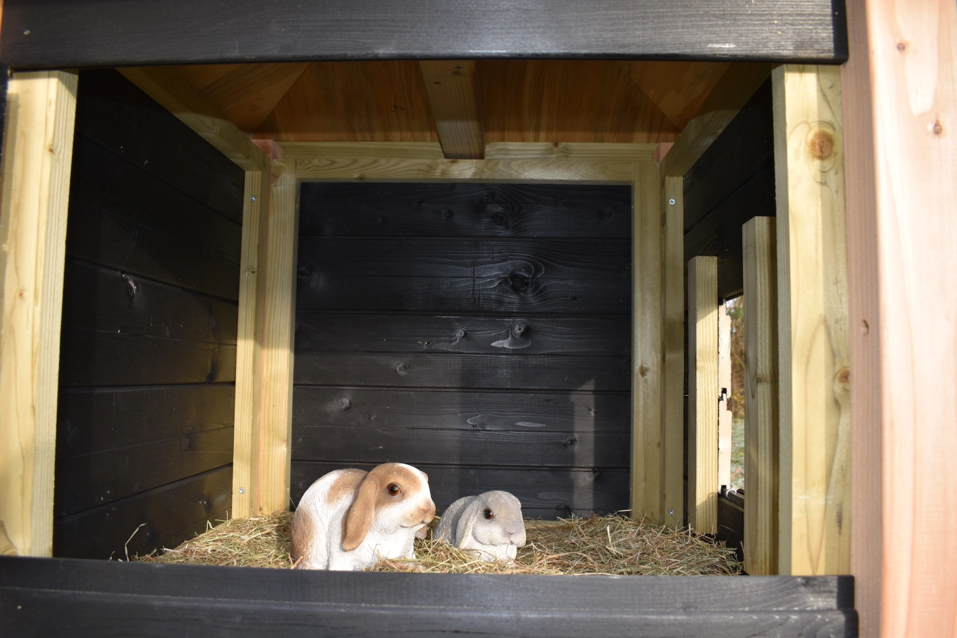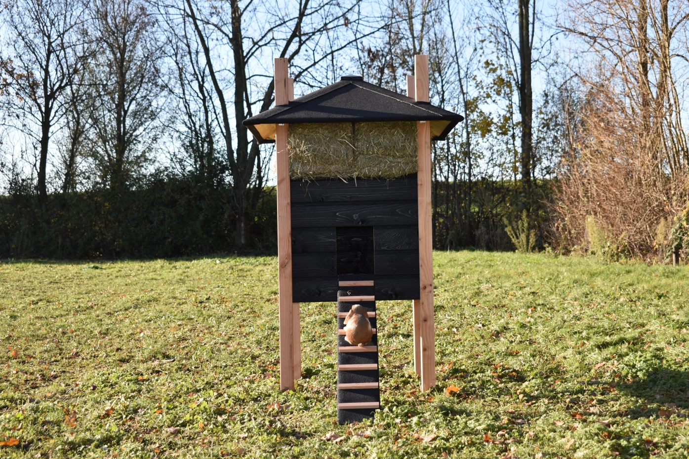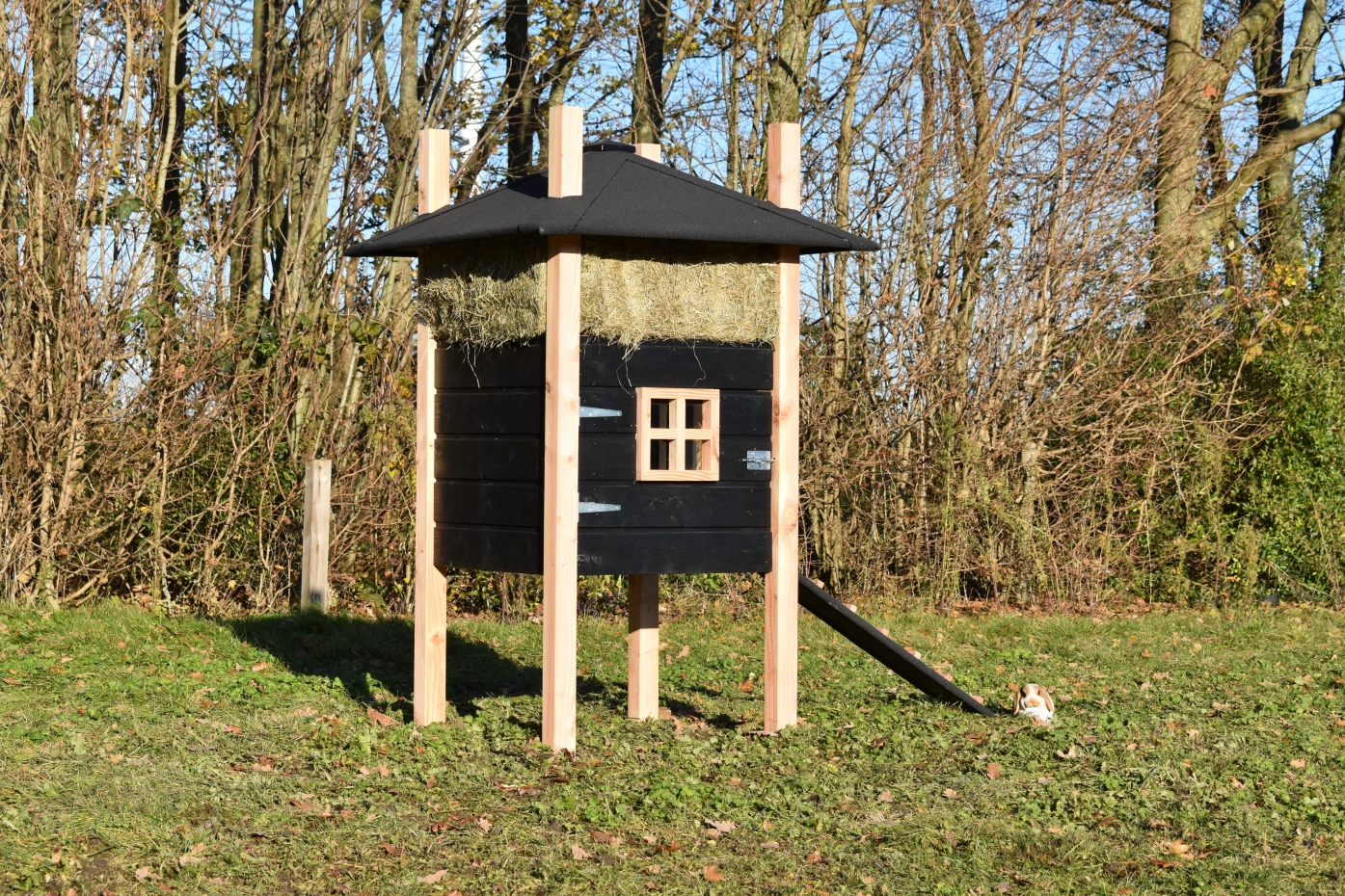 Konijnenhok hooiberg Rosalynn Douglas zwart. Prachtig hok met luxe uitstraling. De combinatie van Douglas palen en zwart rabat maakt dit tot een echte hooiberg! Als u de hooibalen op maat mee besteld hebt u echt een plaatje voor uw tuin. Het hok beschikt over een ruim nachthok met brede toegang deur. Handig in gebruik! Prijs en kwaliteit verhouding is echt top!