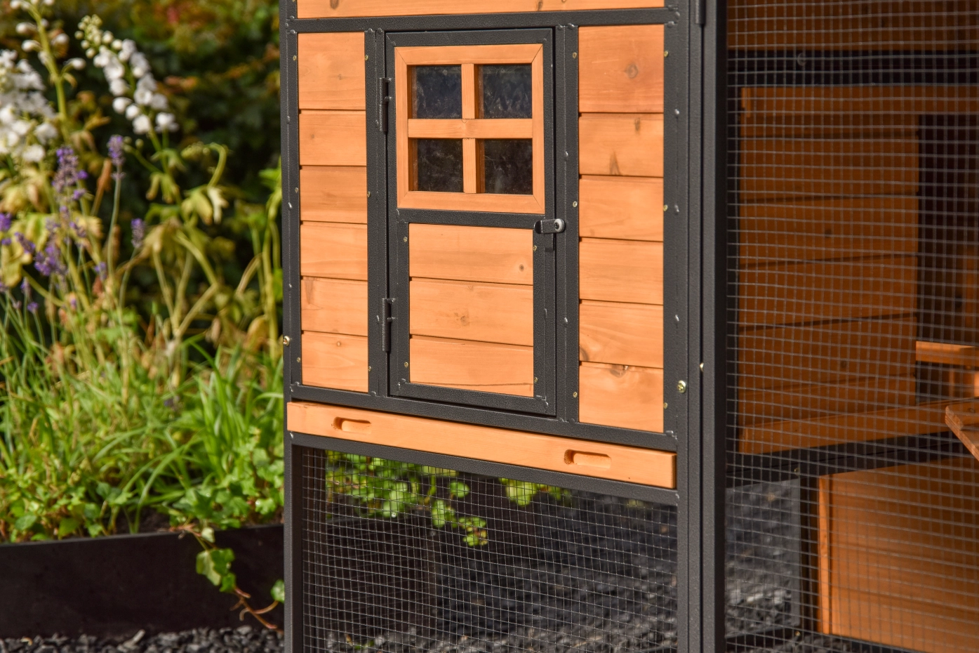 - Dierenhok van dennenhout met stevig, gecoat stalen frame en zwart gaas