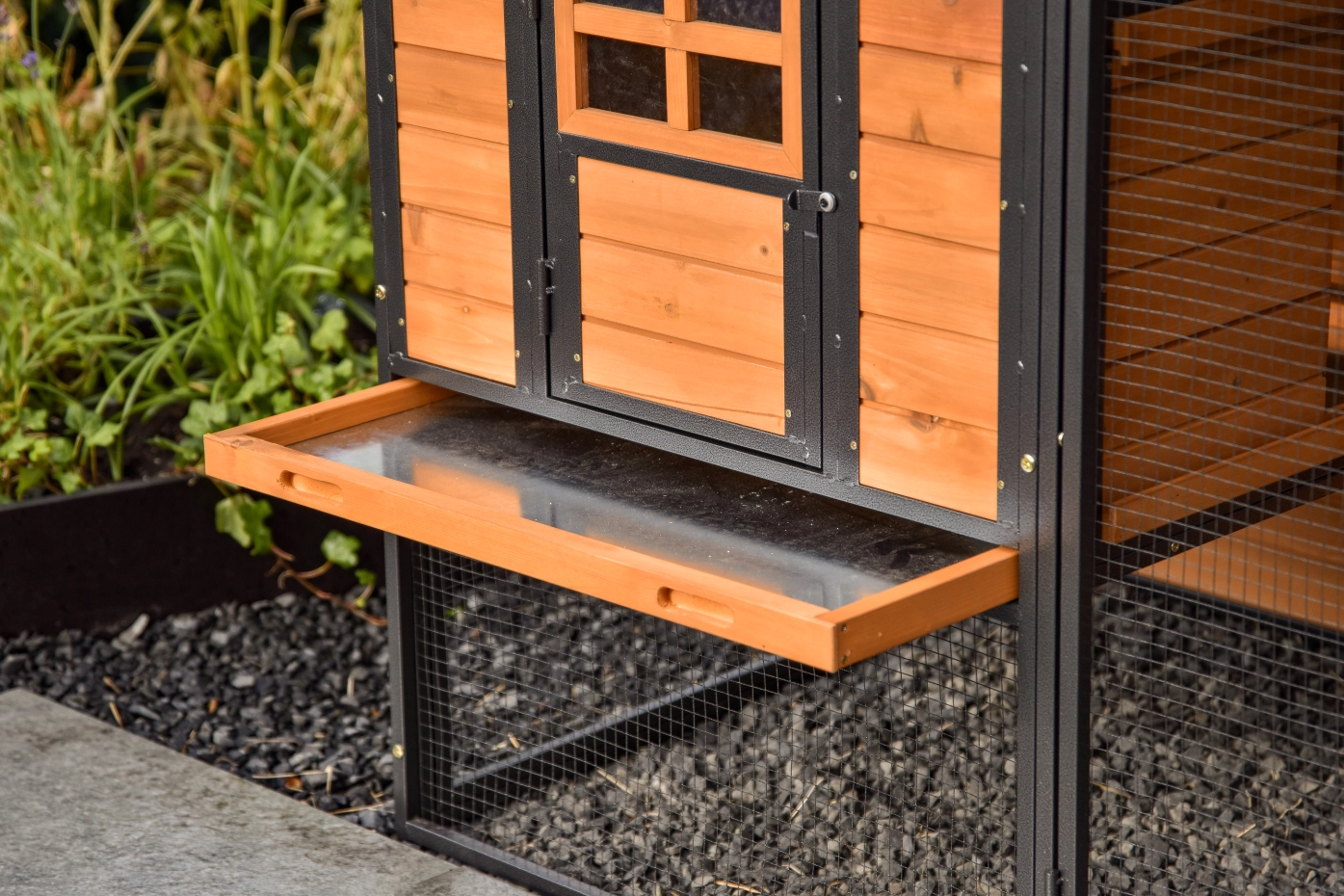 - Metalen schuiflade (zink) om het hok handig schoon te maken