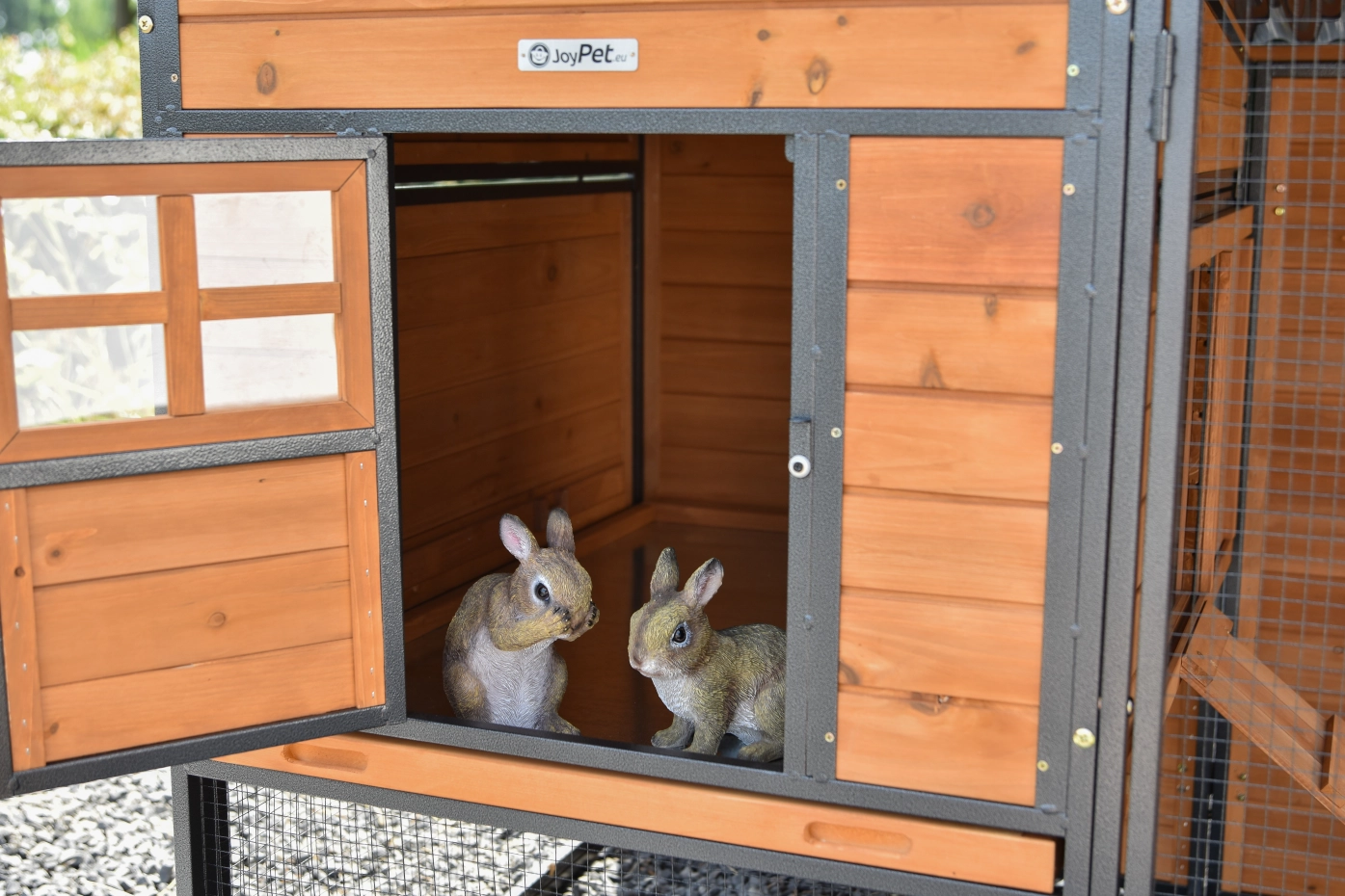 Konijnenhok Judy is zeer ruim en praktisch. Het biedt een comfortabel verblijf voor uw konijnen en heeft een groot nachthok voor extra bescherming. Met een handige schoonmaaklade en een grote ren, is het perfect voor 3 grote konijnen tot 5 kleine konijnen.