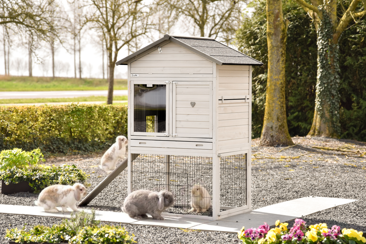 Een ruim en praktisch konijnenhok waarin uw konijnen zich direct thuis voelen. Het royale nachthok zorgt voor comfort en rust, terwijl de grote deuren het onderhoud eenvoudig maken. Dit compacte nachthok is ideaal voor plaatsing in een grote ren of in een weitje, zodat uw konijnen zelf voldoende bewegingsruimte hebben. Dankzij de rubberen poten is het hok beschermd tegen optrekkend vocht. Bovendien is het konijnenhok eenvoudig te combineren met bestaande rennen voor extra ruimte, waardoor u het geheel eindeloos kunt uitbreiden