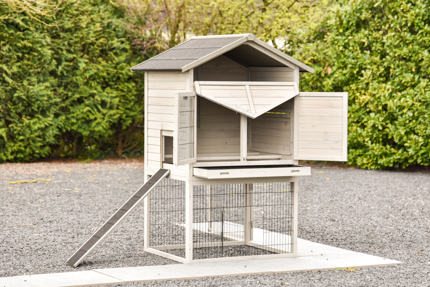 - Wanneer het hok niet op een beschutte plaats staat, dan adviseren wij om het te verankeren