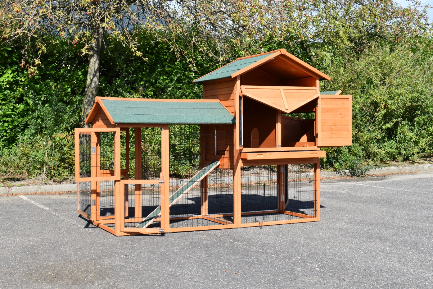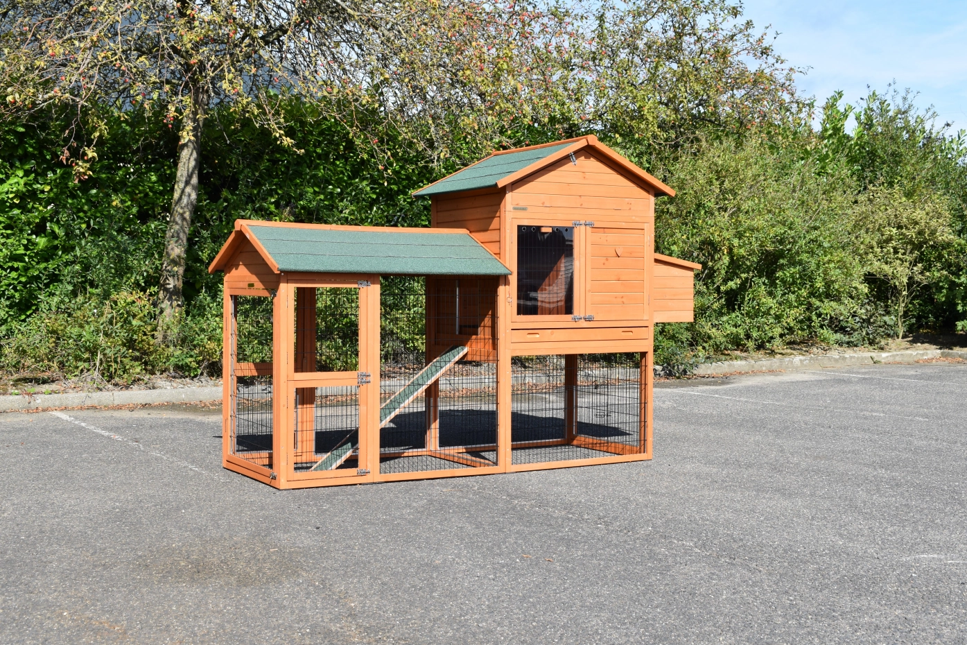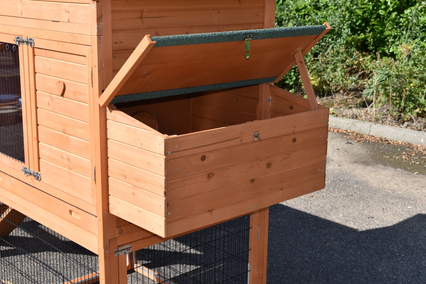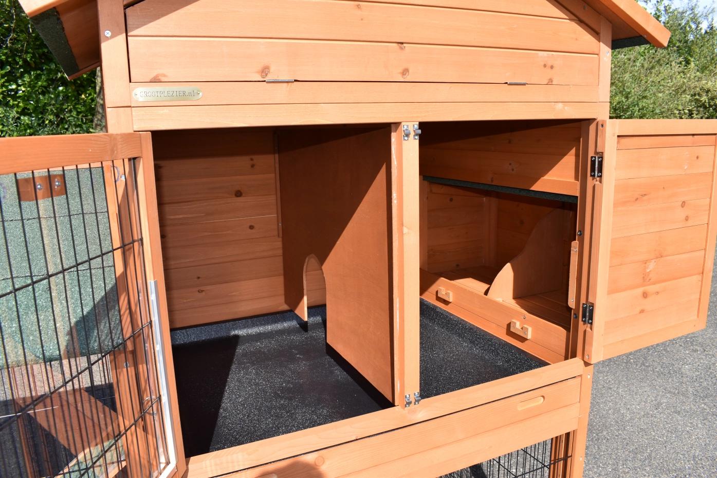 Het konijnenhok Prestige Large is voorzien van een ren aan de linkerkant en een nestkast aan de rechterkant. Het nachthok is geschikt voor 2-4 konijnen. Het ruime nachthok heeft grote deuren en een schuiflade, zodat het makkelijk schoon te maken is.