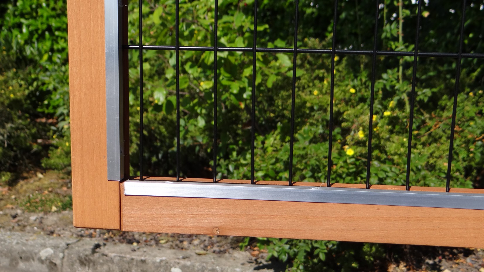 - Stevig zwart gecoat traliewerk, dikte 2 tot 3mm, maaswijdte ca. 25x100mm