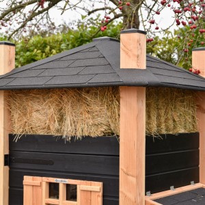 Konijnenhok Hooiberg Sjors heeft een charmante landelijke uitstraling. Dit ruime verblijf past perfect in een landelijke tuin of op de boerderij. Dankzij de royale afmetingen is er volop plek voor meerdere konijnen. Aan het hok zit een grote ren van 123 cm hoog, gemaakt van stevige afrasteringspanelen en voorzien van een houten deur. Zo kunnen je konijnen veilig én met veel bewegingsvrijheid rondhuppelen. Via de grote deur stap je eenvoudig naar binnen voor verzorging en schoonmaak. Binnen is er voldoende beschutting voor rustmomenten en om te schuilen. De bodem is gemaakt van beton-multiplex: sterk, onderhoudsvriendelijk en bestand tegen intensief gebruik.