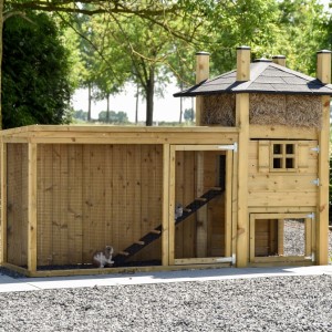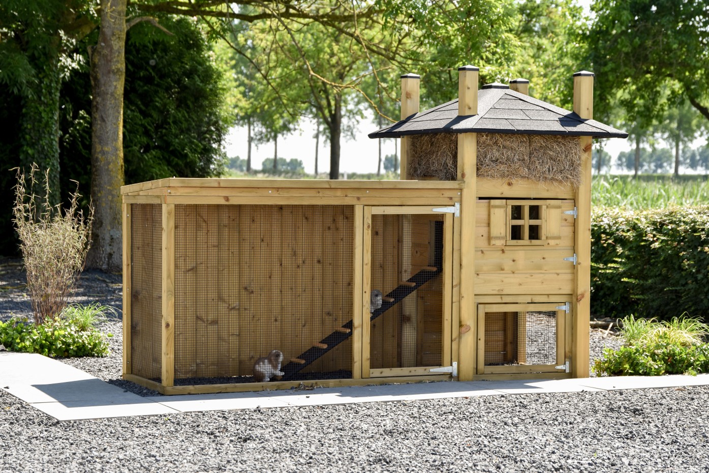 Konijnenhok hooiberg Rosa met ren is een mooi landelijk hok. Het sfeervolle ontwerp maakt je tuin een stuk gezelliger en geeft u een gevoel van landelijk wonen. Aan het hok zit een ruime ren met plat dakleer dak en een ruime deuropening. In het konijnenhok zit een brede deur voor een gemakkelijke schoonmaak. De achterkant van de ren is dicht zodat de konijnen lekker beschut kunnen rusten.