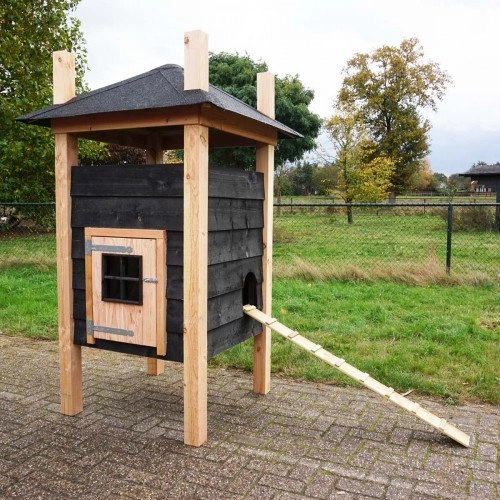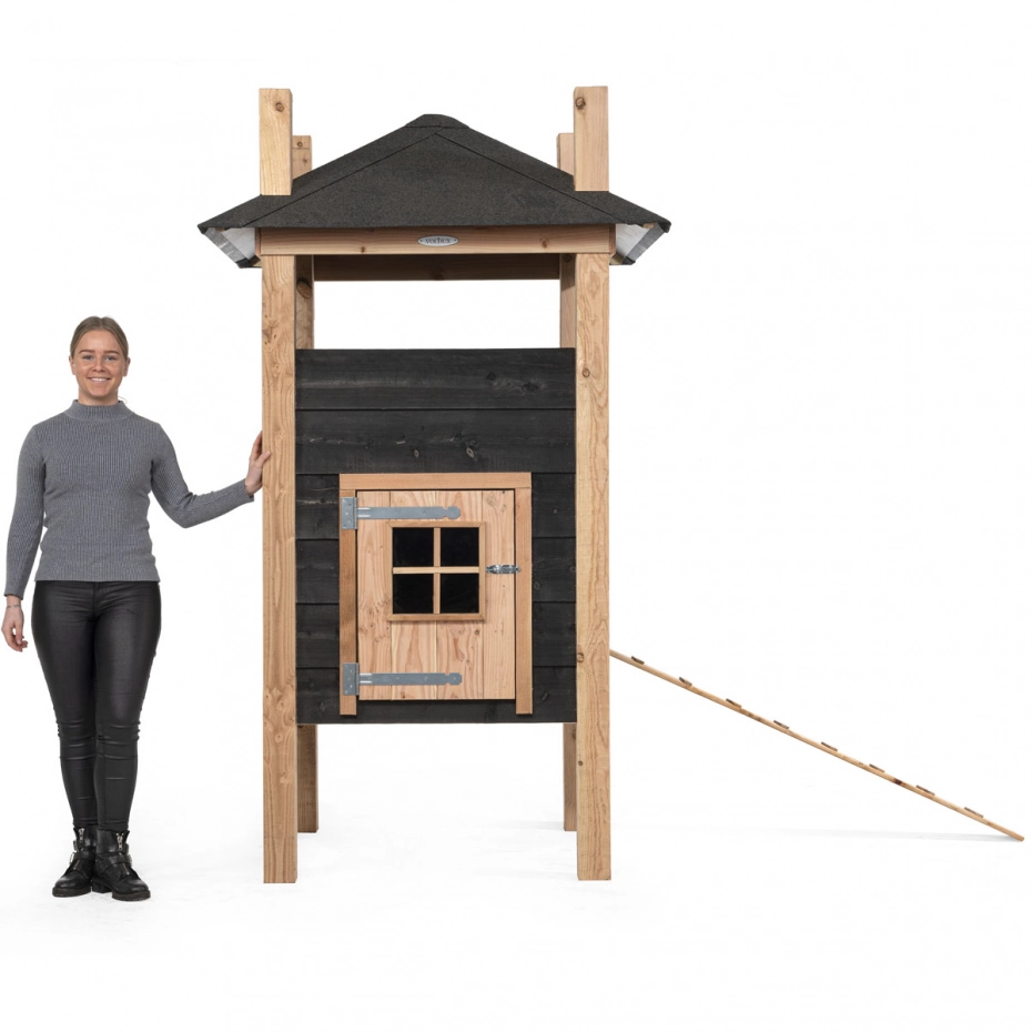 Het bijzondere konijnenhok Teun is opgebouwd als prachtige onderhoudsvrije hooiberg voor in de tuin of konijnenren. Deze opvallende verschijning is hierdoor niet alleen comfortabel voor jouw konijnen hij geeft jouw dierenren ook een stijlvolle en klassieke uitstraling. De hooiberg is gemaakt van hoogwaardige materialen zo is er gekozen voor een stijlvol douglas houten frame welke met grove balken het dak verhoogd. Hierdoor is het mogelijk dit konijnenhok tevens te gebruiken voor de hooiopslag. De grote hooiberg is afgewerkt met zwarte potdekseldelen wat een chique combinatie geeft met het Douglas houten frame van dit konijnenhok. De binnenruimte van de konijnenhooiberg heeft een afmeting van 97x97cm hierdoor is deze zeer geschikt voor de huisvesting van meerdere konijnen en zelfs grote konijnenrassen kunnen comfortabel verblijven in dit konijnenhok. Het nachthok beschikt over een deur aan de voorzijde welke door middel van een plexiglas raampje ook licht toelaat in het verblijf. De eenvoudig te bereiken trap geeft jouw konijnen de mogelijkheid de buitenruimte zelf te betreden. Deze konijnenvilla is hierdoor perfect te gebruiken in een konijnenren waar de konijnen los lopen maar wel voldoende schuil en slaap mogelijkheid moeten hebben.