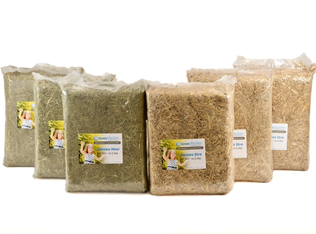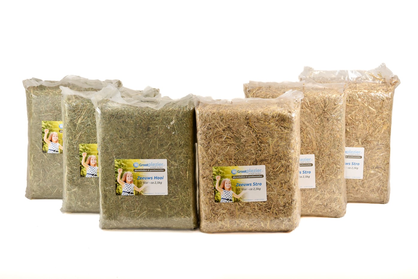 Vers Zeeuws Hooi en Vers Zeeuws Stro. Zó van de Zeeuwse weilanden, dat zal uw huisdier waarderen. Pak mee dat voordeel ! 3 grote pakken stro 2,5kg en 3 grote pakken hooi 2,5kg. Bestel hooi en stro direct mee bij een konijnenhok, en u betaalt geen extra verzendkosten!