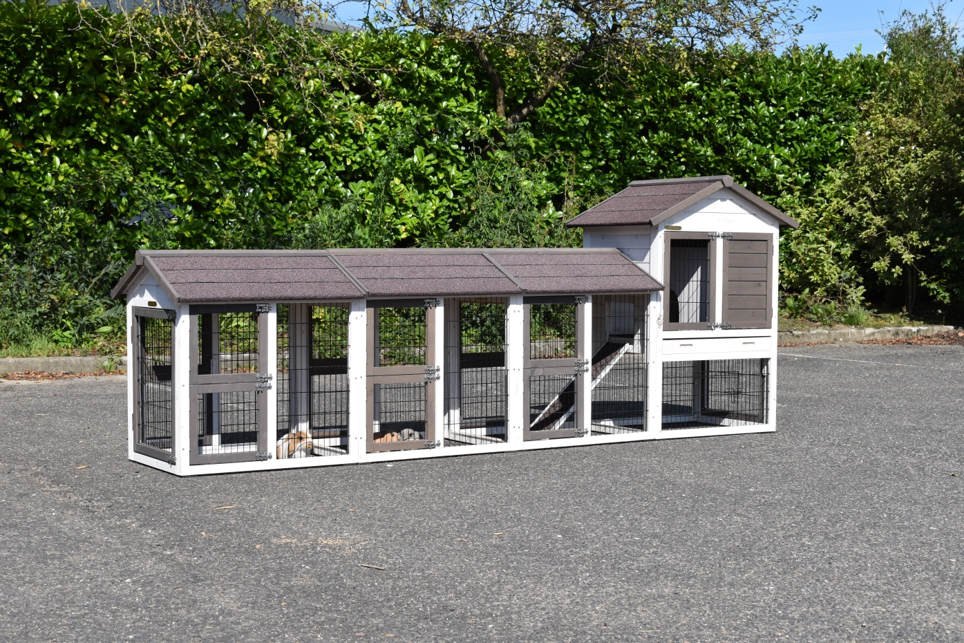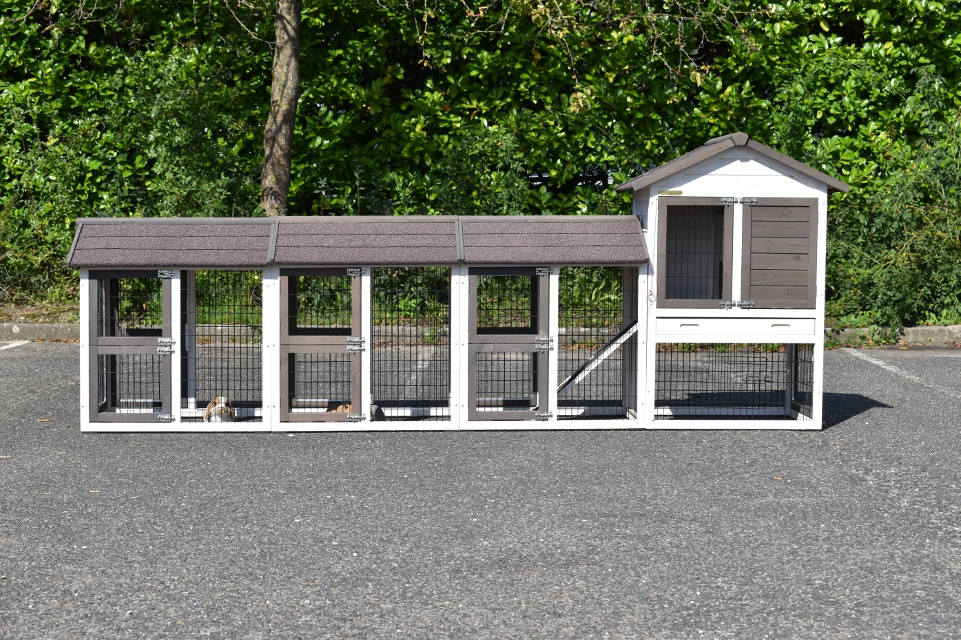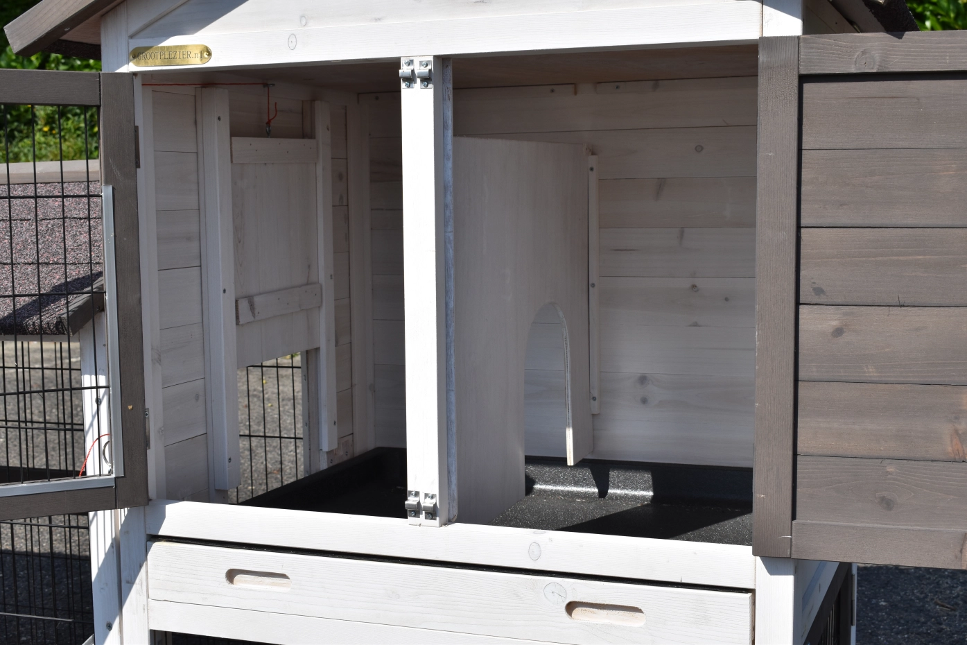 Het konijnenhok Prestige Small is uitgebreid met 3 rennen, om uw konijnen meer ruimte te geven. Het nachthok is geschikt voor 2 konijnen. Het hok is voorzien van grote deuren en een schuiflade onder het nachthok, zodat het makkelijk schoongemaakt kan worden.