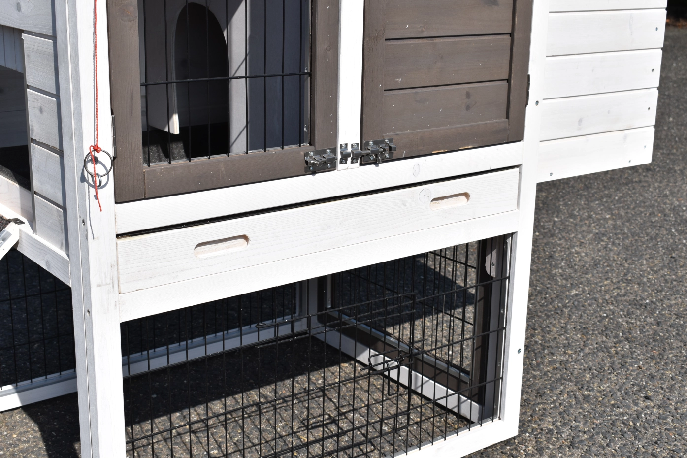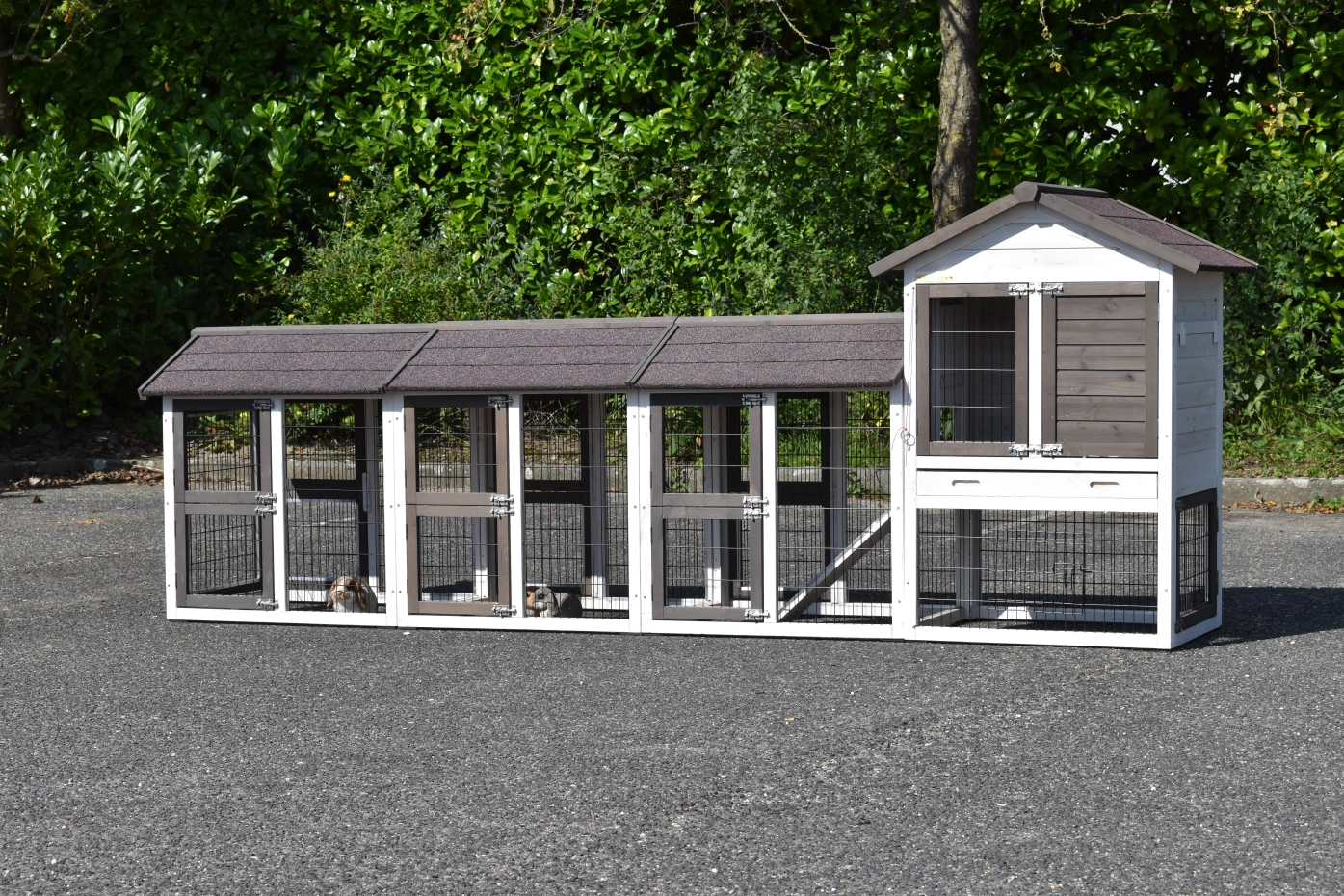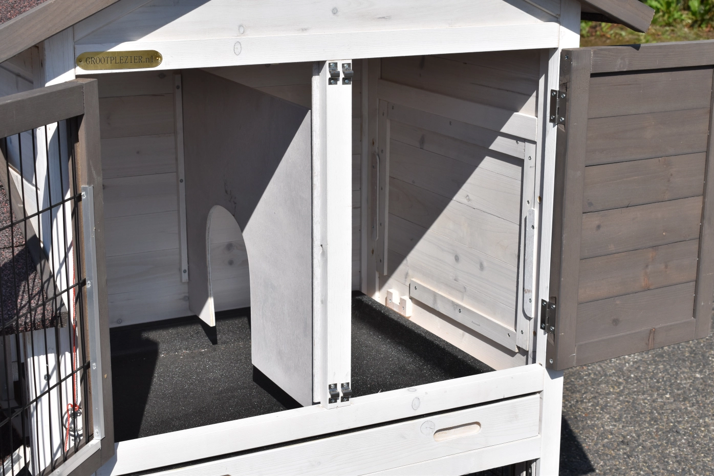 Het konijnenhok Prestige Small is uitgebreid met 3 rennen, om uw konijnen meer ruimte te geven. Het nachthok is geschikt voor 2 konijnen. Het hok is voorzien van grote deuren en een schuiflade onder het nachthok, zodat het makkelijk schoongemaakt kan worden.