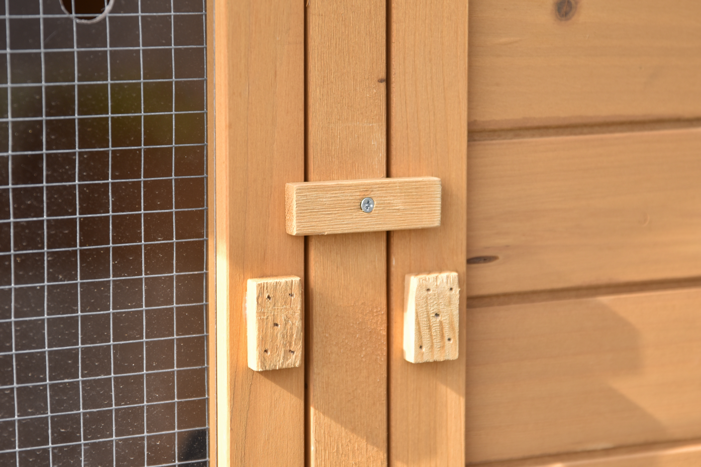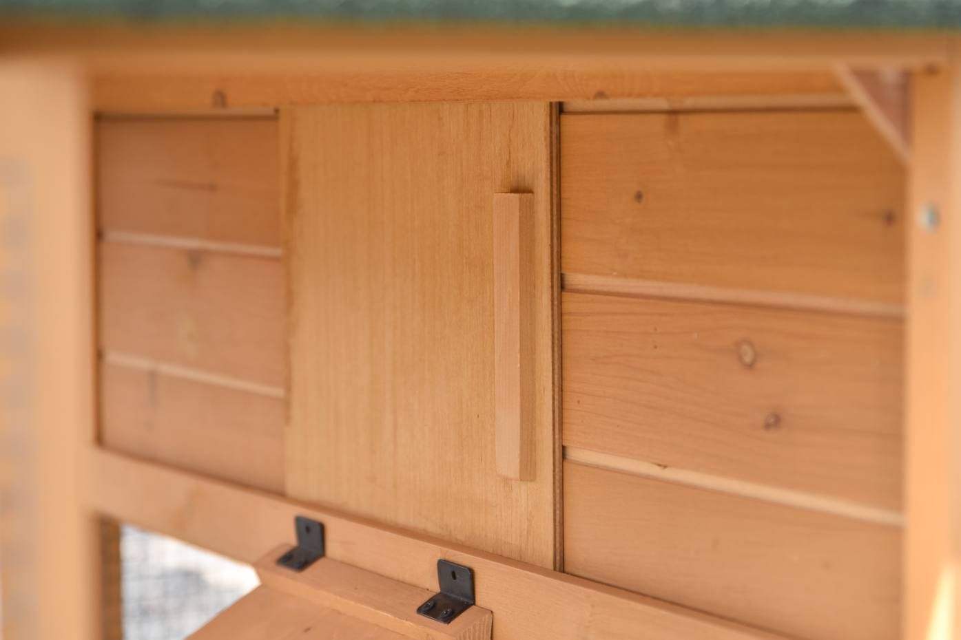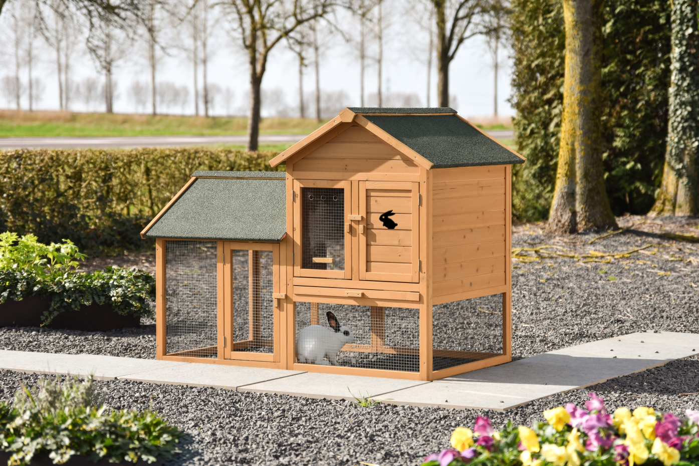 Het dak is afgewerkt met dakleer voor extra bescherming tegen regen. Het gaasdeurtje heeft een plexiglas plaatje dat extra beschutting biedt. De houten deur met een zwart houten konijn als decoratie geeft het kippenhok bovendien een speels en herkenbaar detail, wilt u een ander diertje of een wit konijn, pas uw keuze aan.