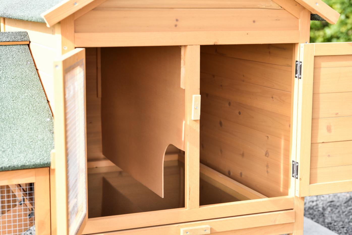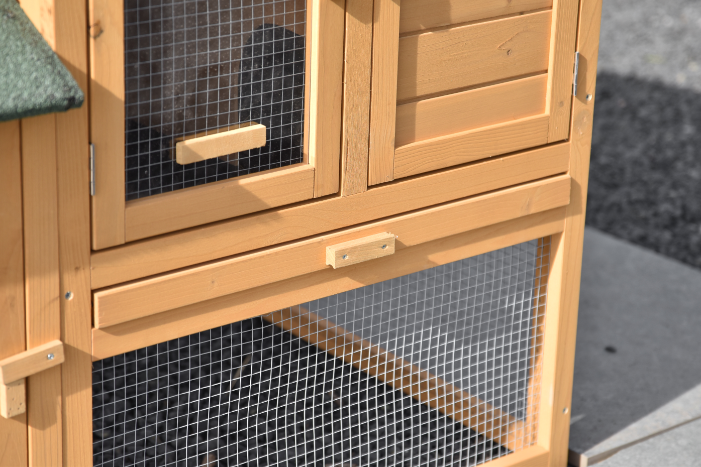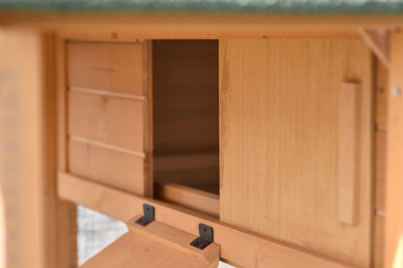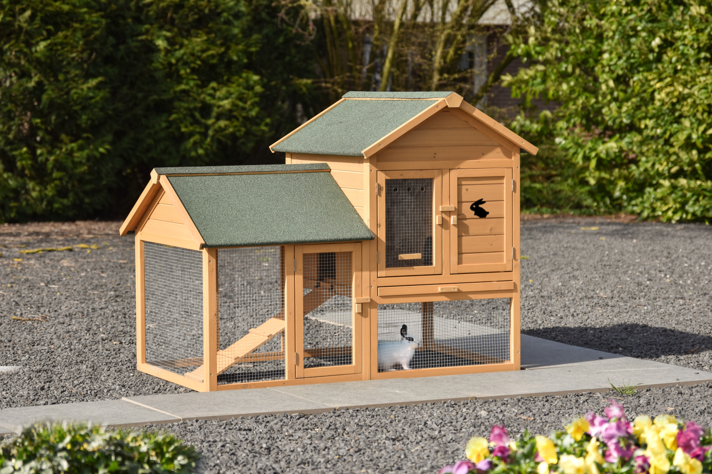 Het dak is afgewerkt met dakleer voor extra bescherming tegen regen. Het gaasdeurtje heeft een plexiglas plaatje dat extra beschutting biedt. De houten deur met een zwart houten konijn als decoratie geeft het kippenhok bovendien een speels en herkenbaar detail, wilt u een ander diertje of een wit konijn, pas uw keuze aan.