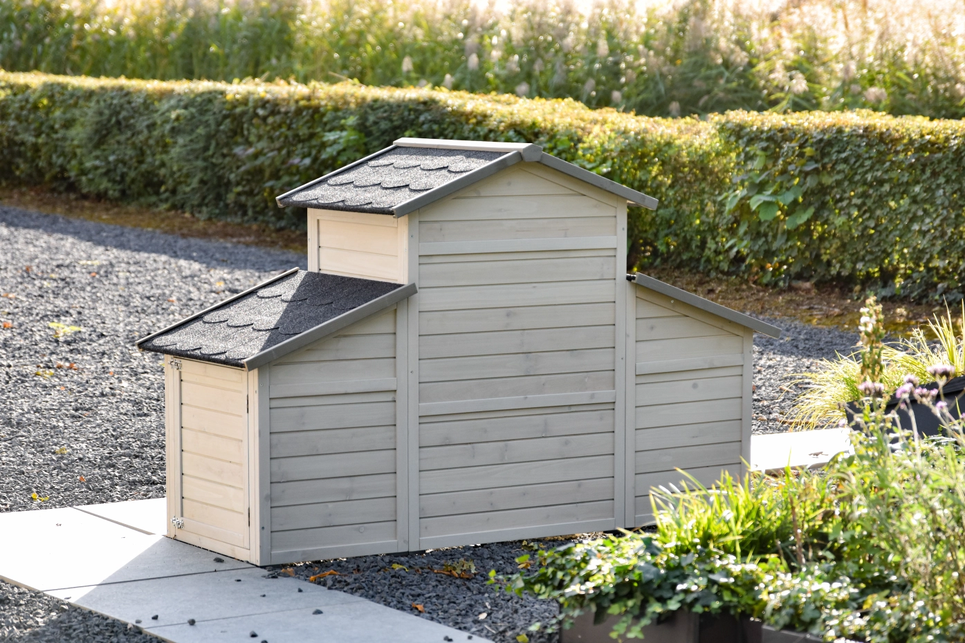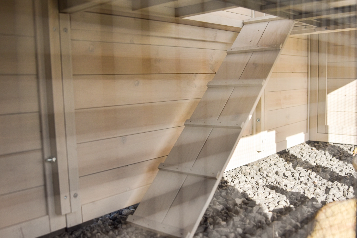 - Wanneer het hok niet op een beschutte plaats staat, dan adviseren wij om het te verankeren