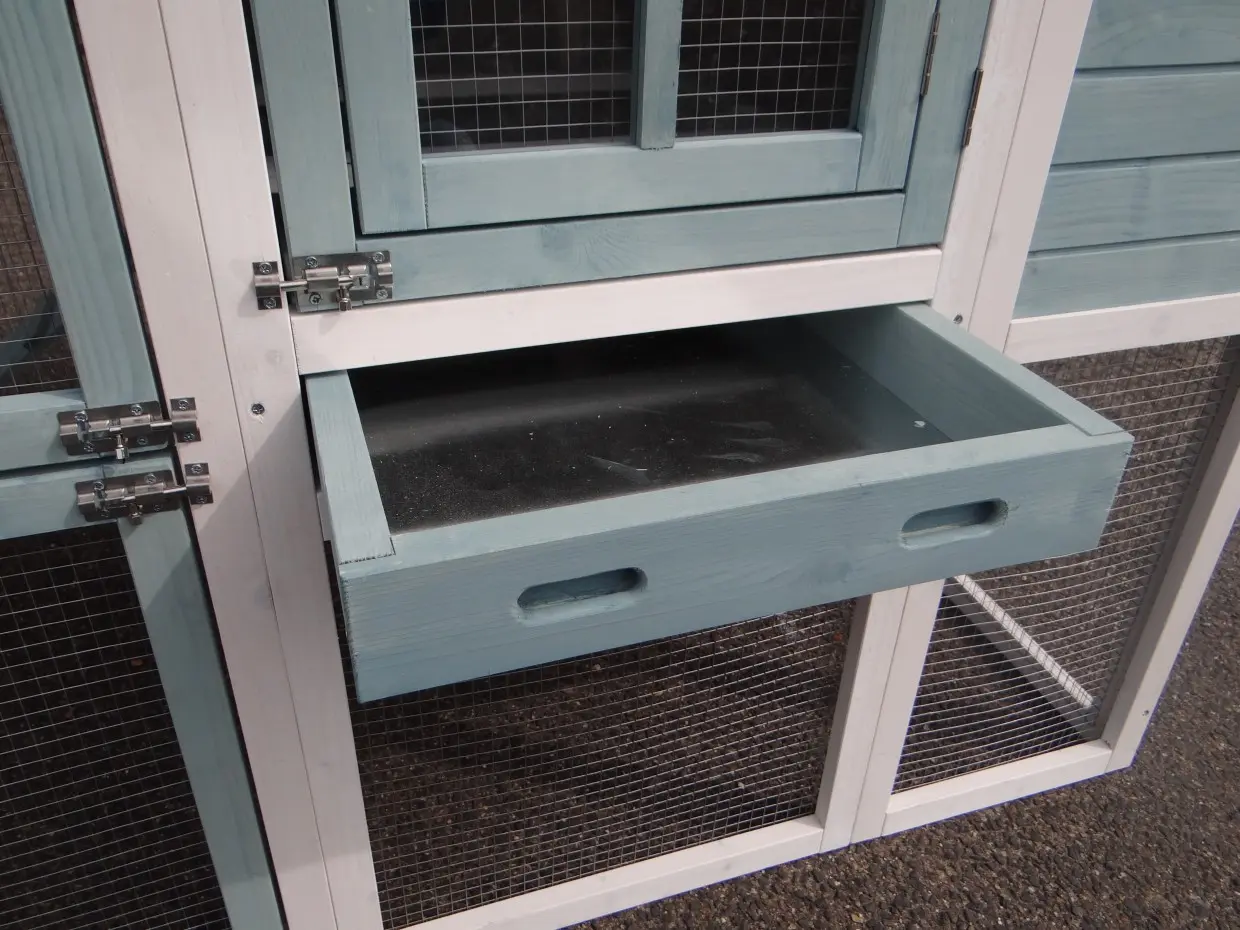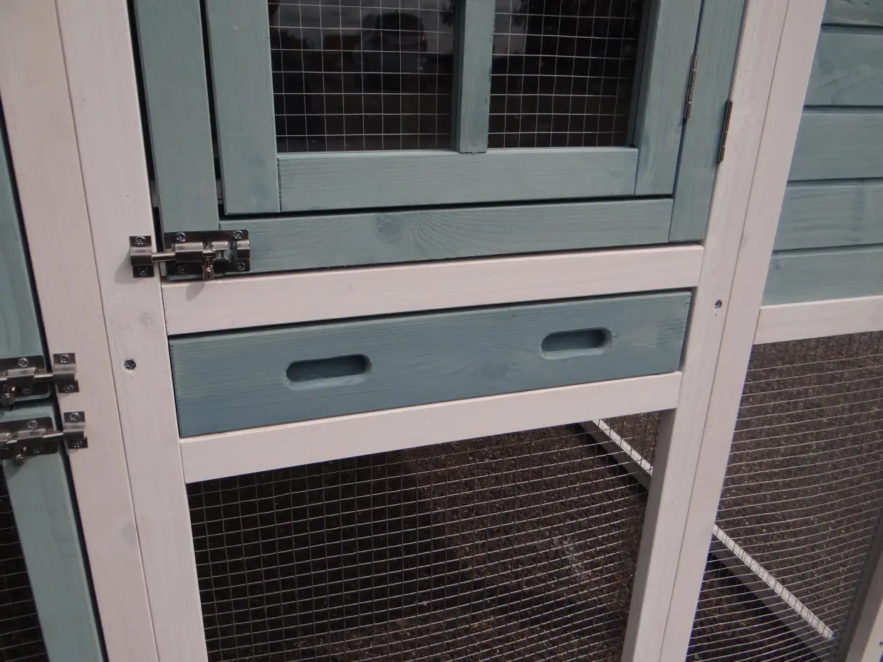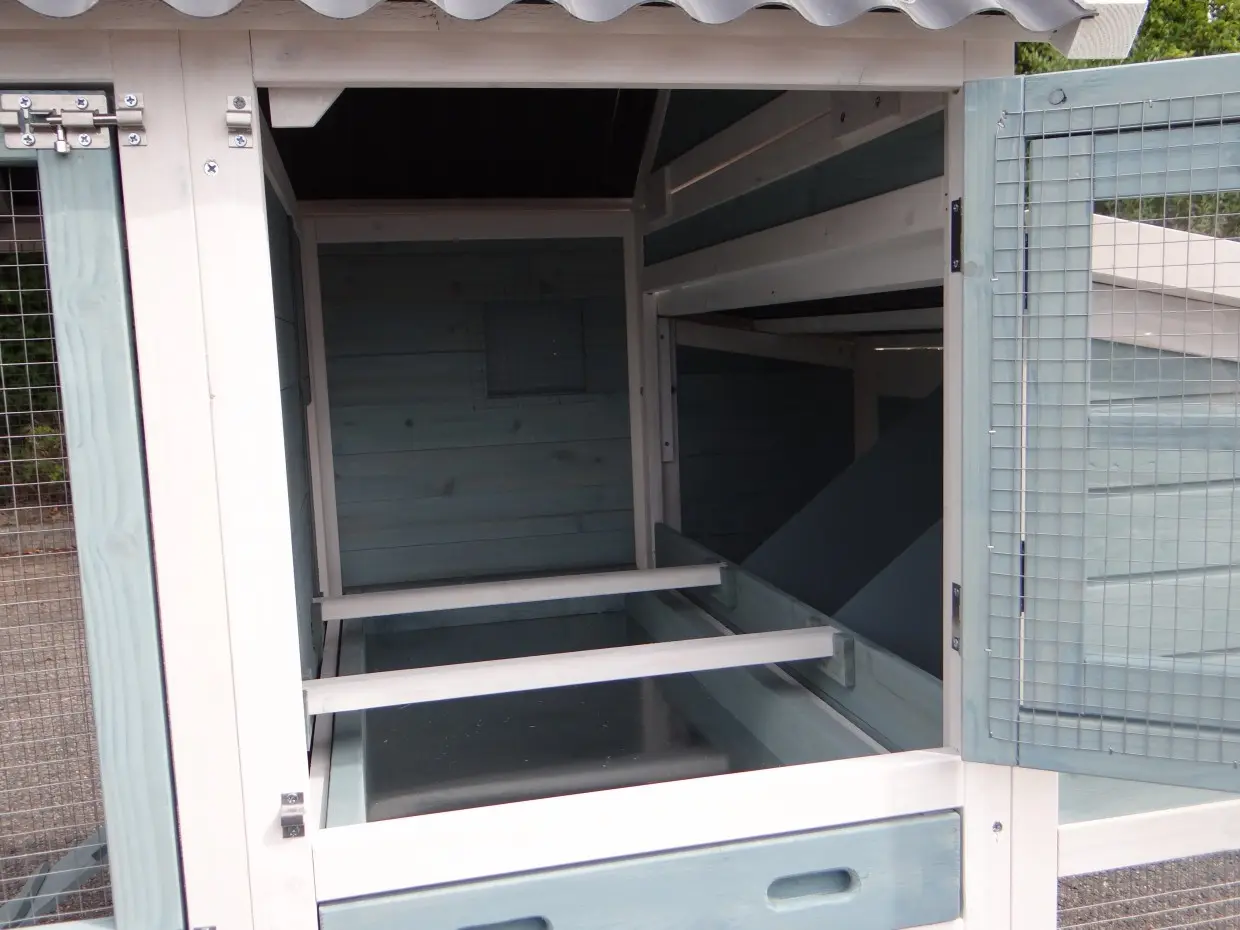 - Metalen schuiflade (zink) om het hok handig schoon te maken