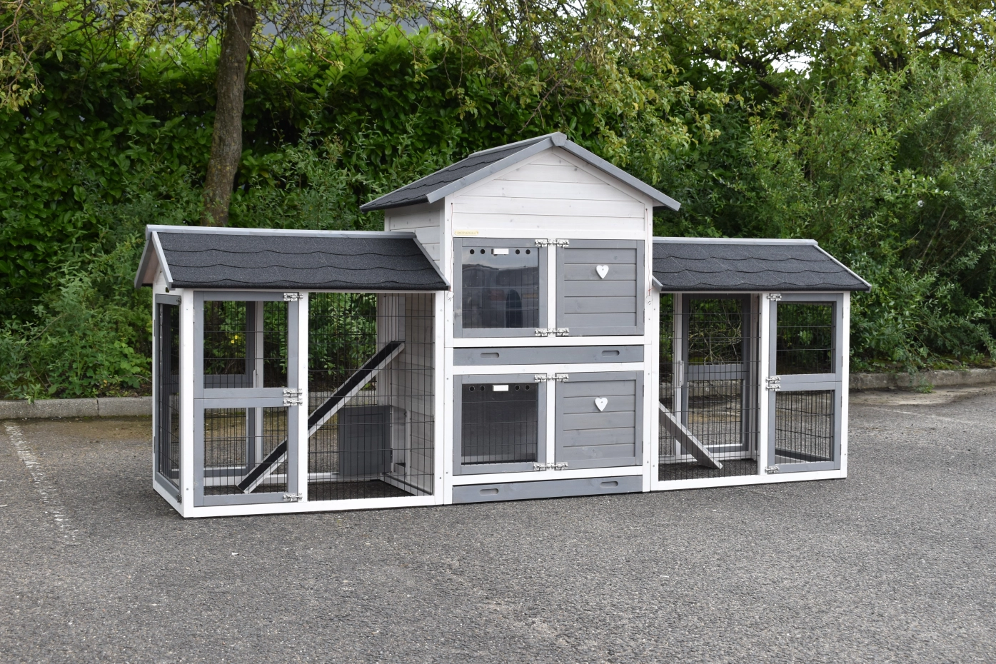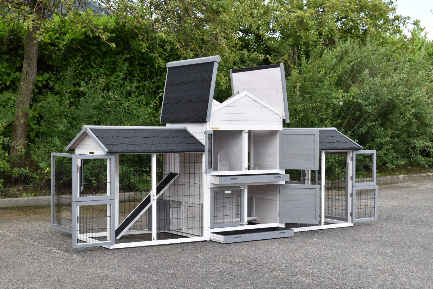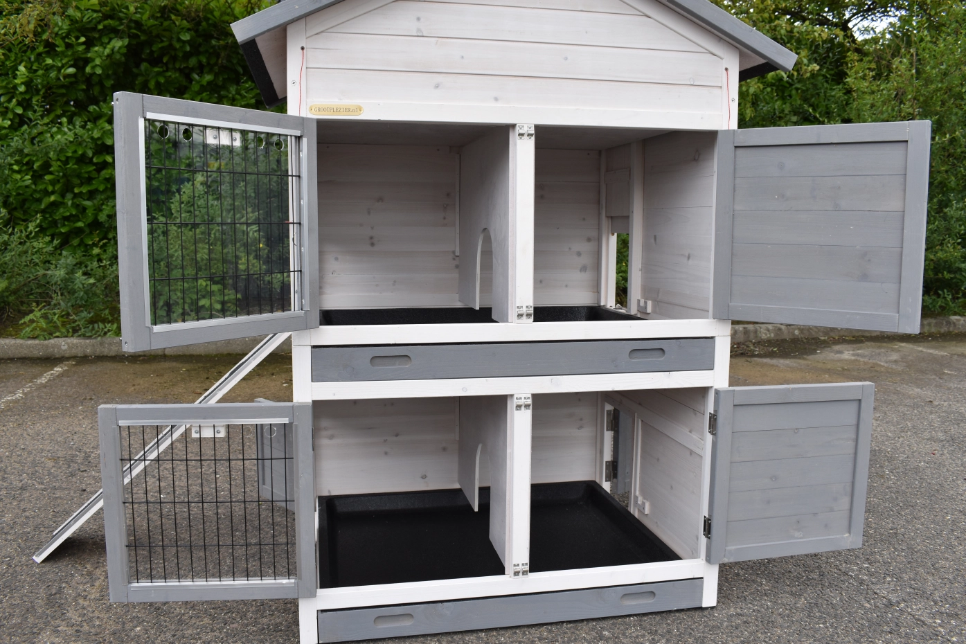 Het konijnenhok Double Medium met 2 rennen is een hoogwaardige en ruime huisvestingsoptie voor je konijnen. Voorzien van anti-knaag afwerking op alle deuren, twee afsluitbare nachthokken, twee ruime rennen en twee handige loopplanken. Dit hok is ideaal om meerdere konijnen gescheiden te houden in comfort en stijl.