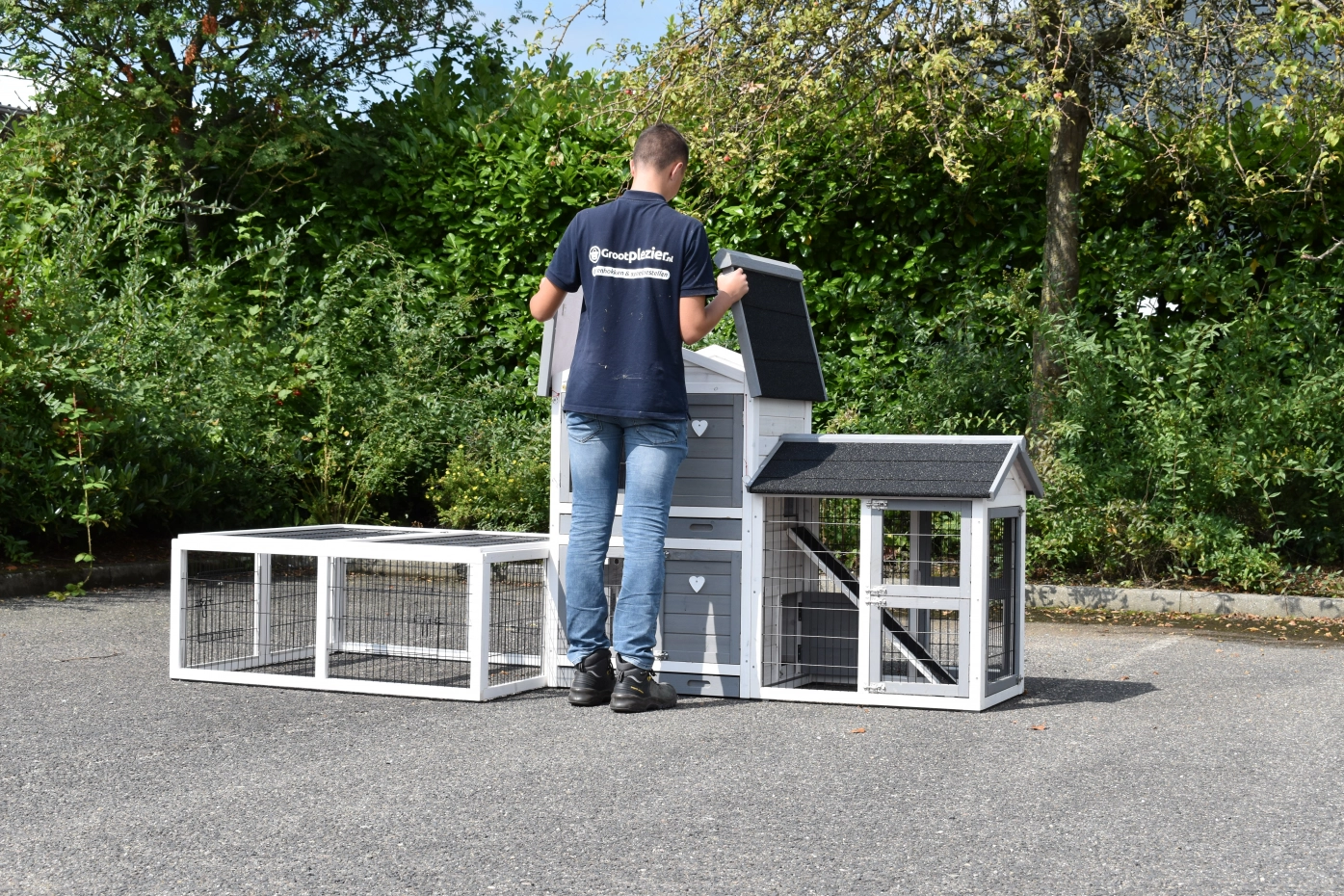 - Wanneer het hok niet op een beschutte plaats staat, dan adviseren wij om het te verankeren