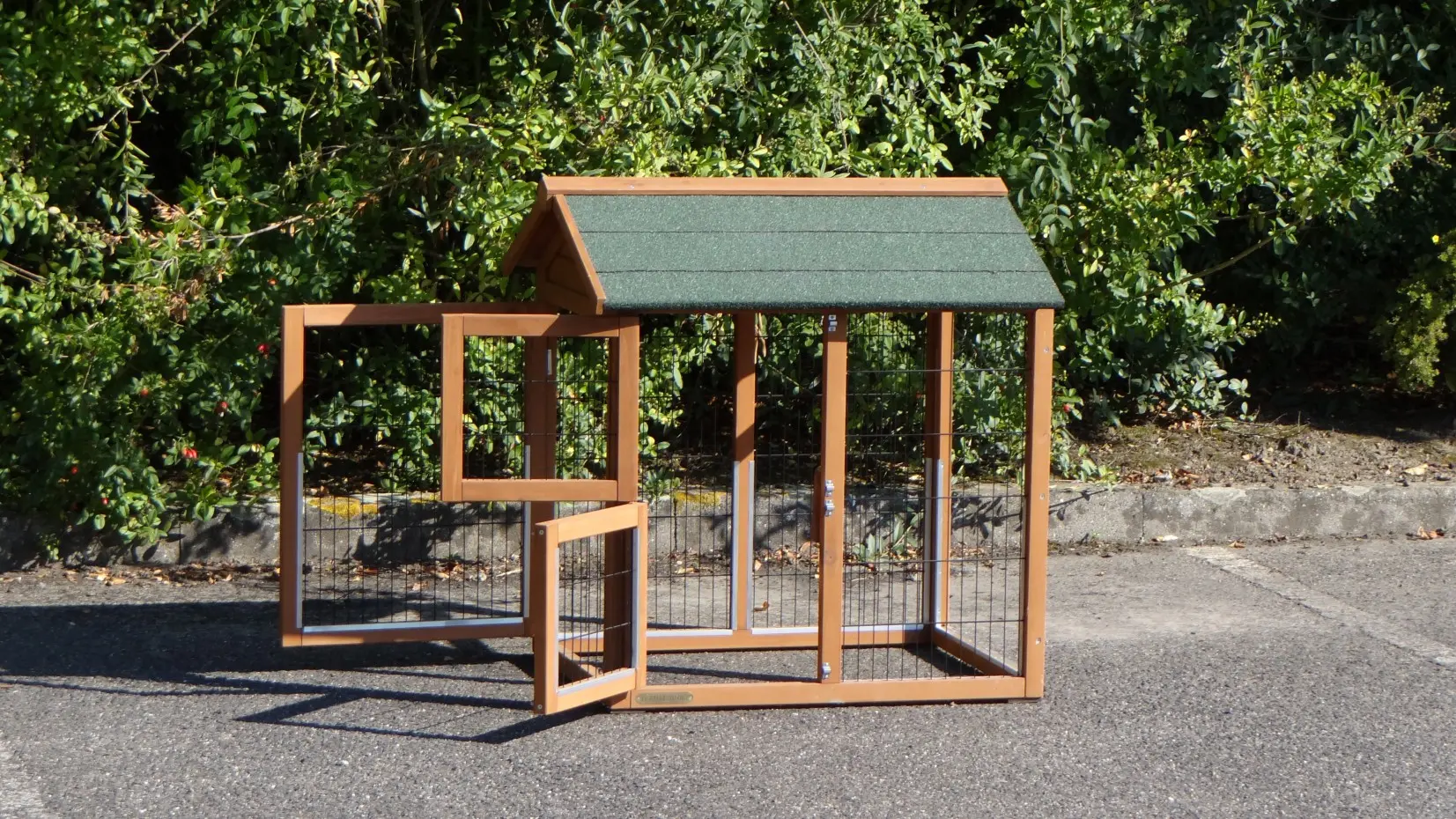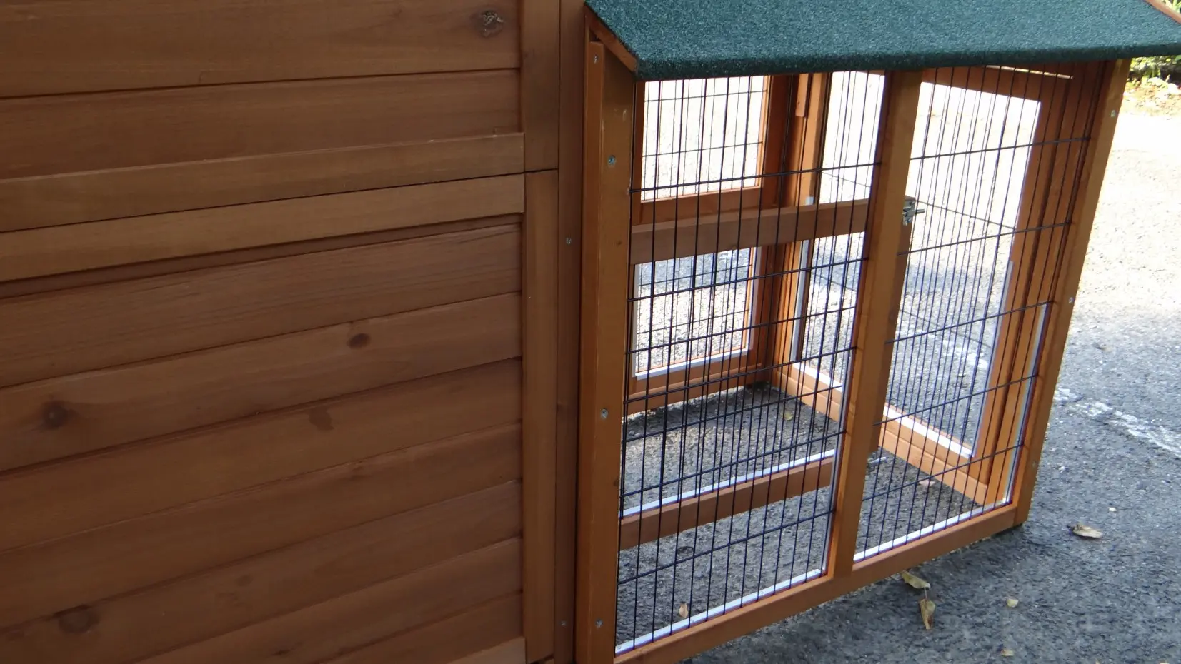- Het hok heeft een dak met dakleer